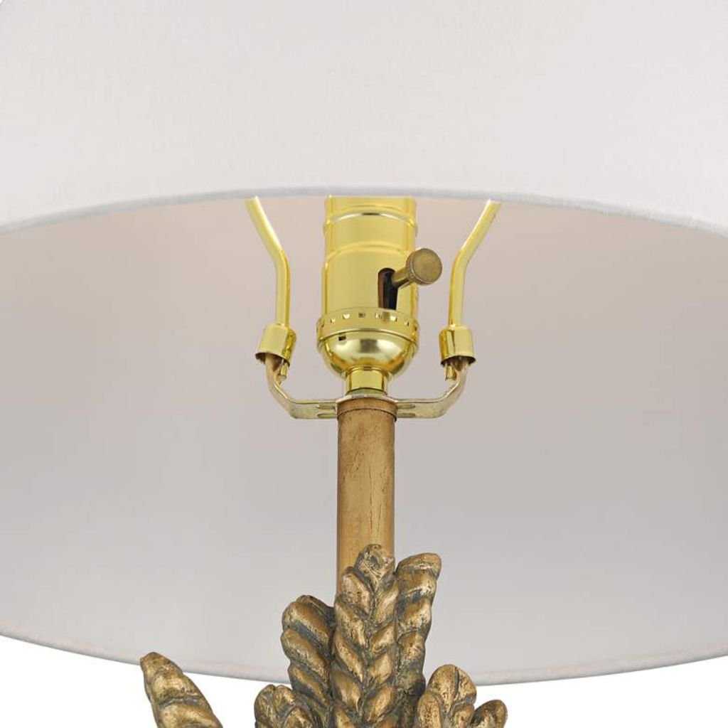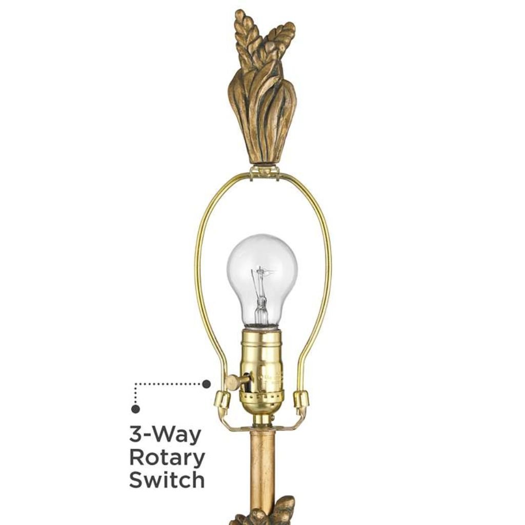 The faux gold leaf finish brings warmth and a softly aged look, while the feather-arrow detailing adds texture and artistic interest. The crisp white empire shade balances the ornate base and diffuses light for a soft, inviting glow.