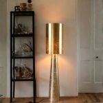 This gold floor lamp features a cylindrical drum shade with genuine gold leaf detailing for an antiqued, shimmering effect. The tall format and warm metallic finish make it work beautifully against dark walls or rich colour palettes, where the gold seems almost to glow from within. It is equally impressive in a more neutral setting, where it reads as a quiet, luxury statement.