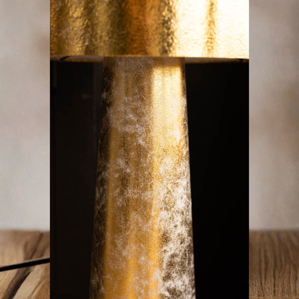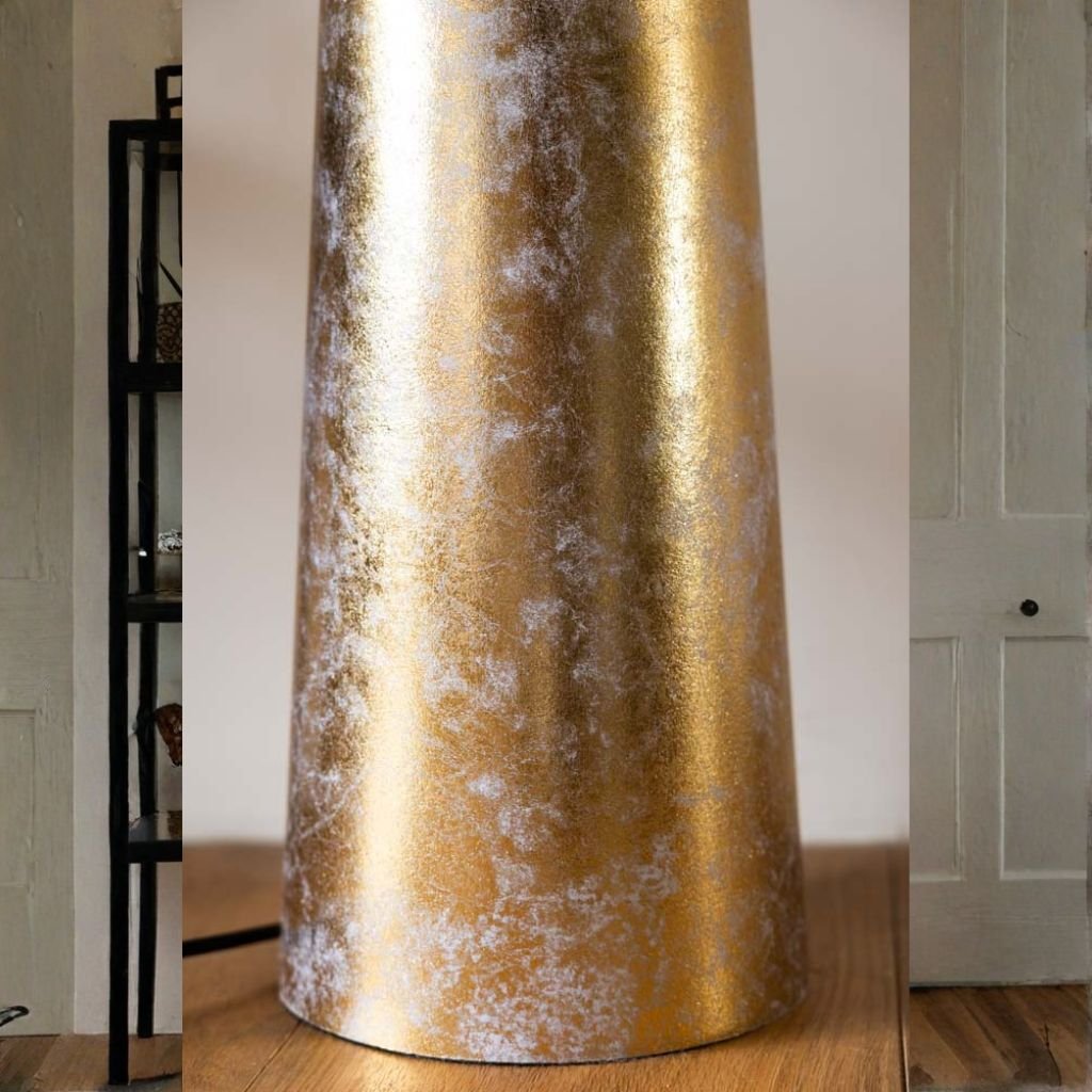 The cylindrical shade is wrapped in gold leaf detailing that catches and reflects light in a way flat paint simply cannot. The effect is warm, layered, and genuinely beautiful up close.