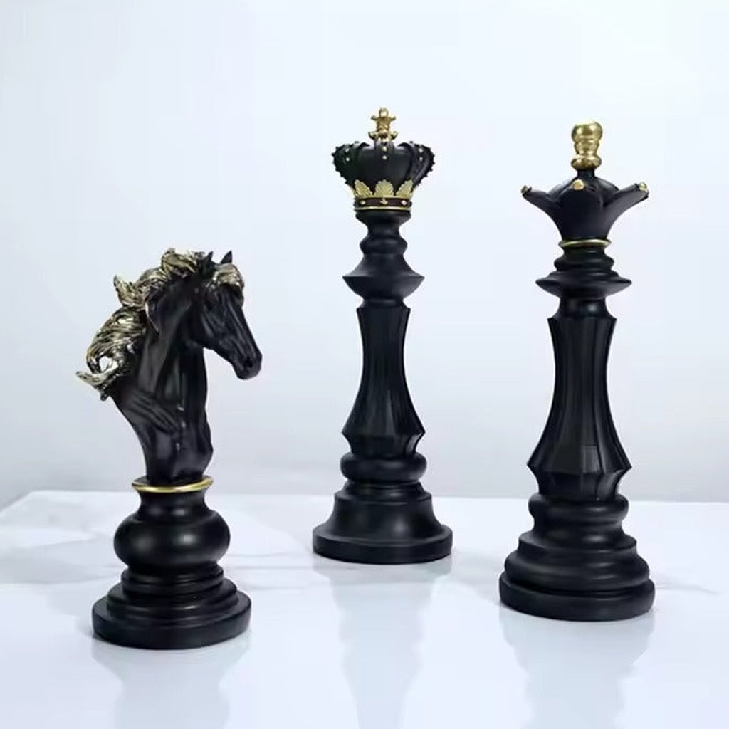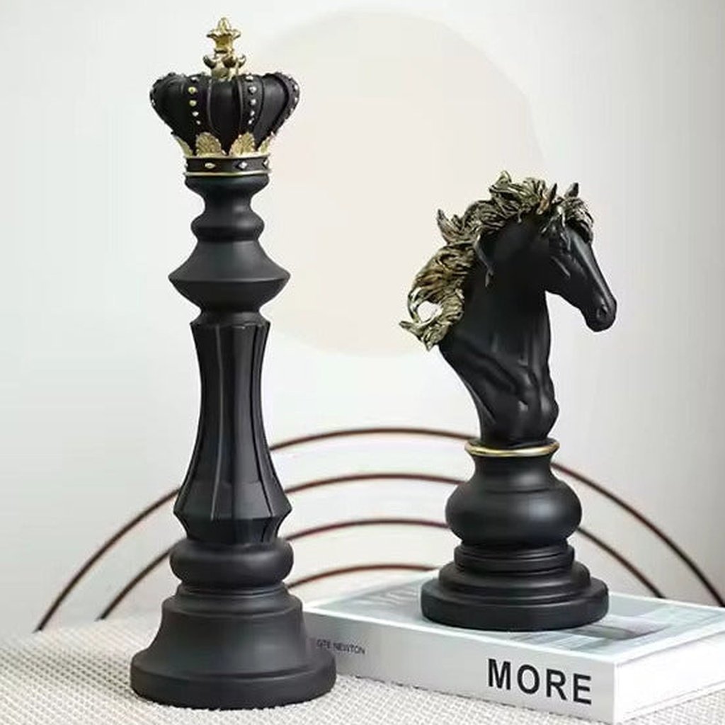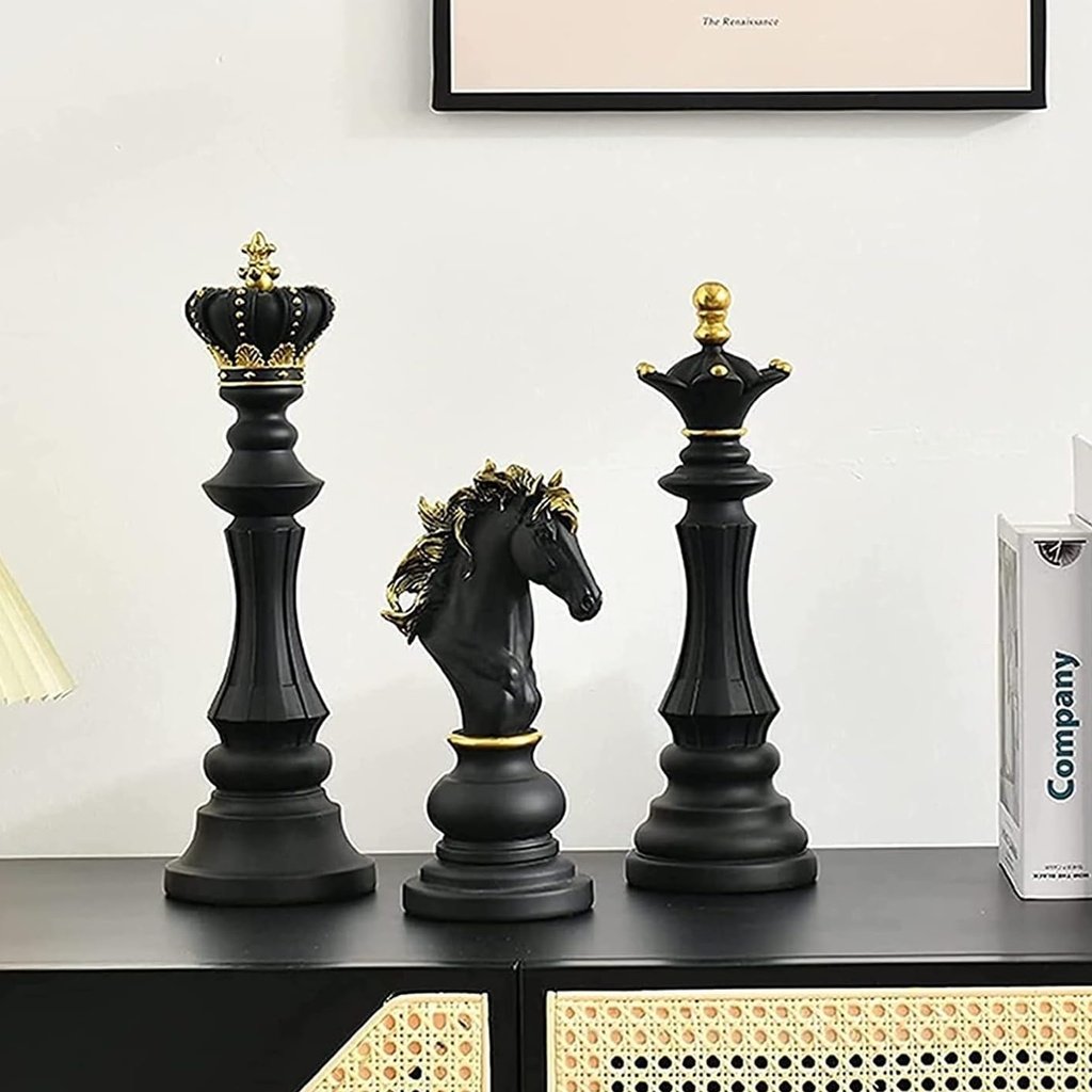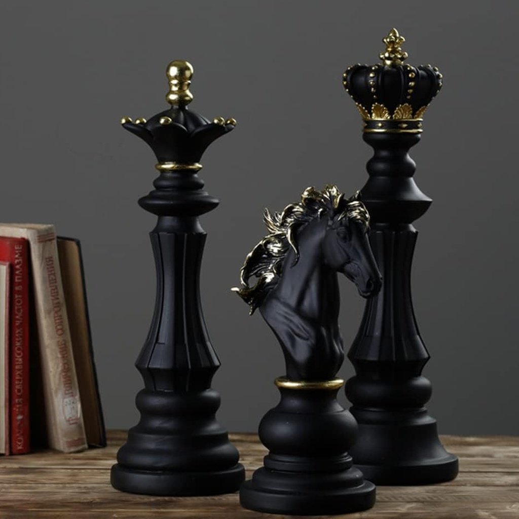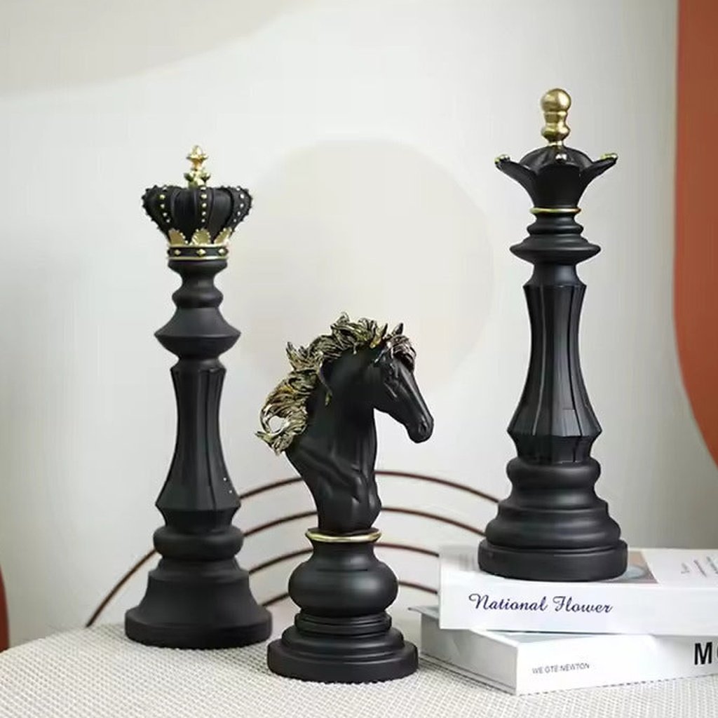 These chess piece sculptures are more than just decor; they’re a statement of elegance. Each piece is crafted from premium resin, capturing the grandeur of chess with a sleek black finish and subtle golden accents. They stand tall and proud, making them ideal for adding a sophisticated touch to your office desk, bookshelf, or console table.