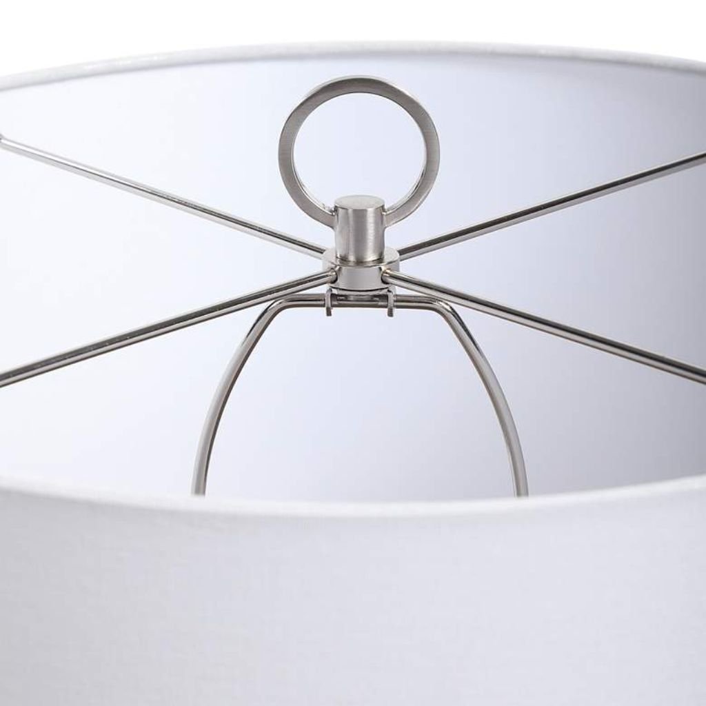 On a bedside table or console, the right lamp changes everything — and the Cyprien, designed by Renee Wightman for Uttermost, changes it through surface rather than silhouette. This crackled white ceramic table lamp presents a shapely jar form finished in a dual-glaze treatment that makes the base as visually interesting as anything else in the room. Brushed gray and crackled gloss white glaze interact across the ceramic surface in an abstract pattern — the matte gray absorbing light while the crackled gloss white reflects and fractures it along every fine fissure line. Brushed nickel finish iron accents at the hardware maintain palette consistency between the gray tones in the glaze and the metallic fittings above. A round white linen hardback drum shade completes the lamp with clean, structured calm — the composed counterpoint to the expressive surface below.