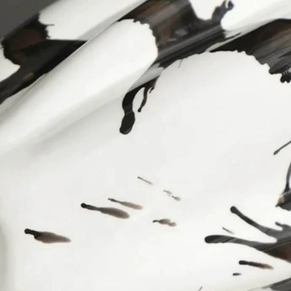 The black and white splatters are applied freehand, creating a dynamic, textured surface that shifts slightly depending on the light and angle. The contrast is bold without being harsh — graphic enough to stand out, balanced enough to work across a range of interiors.