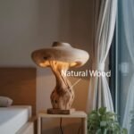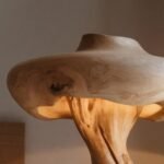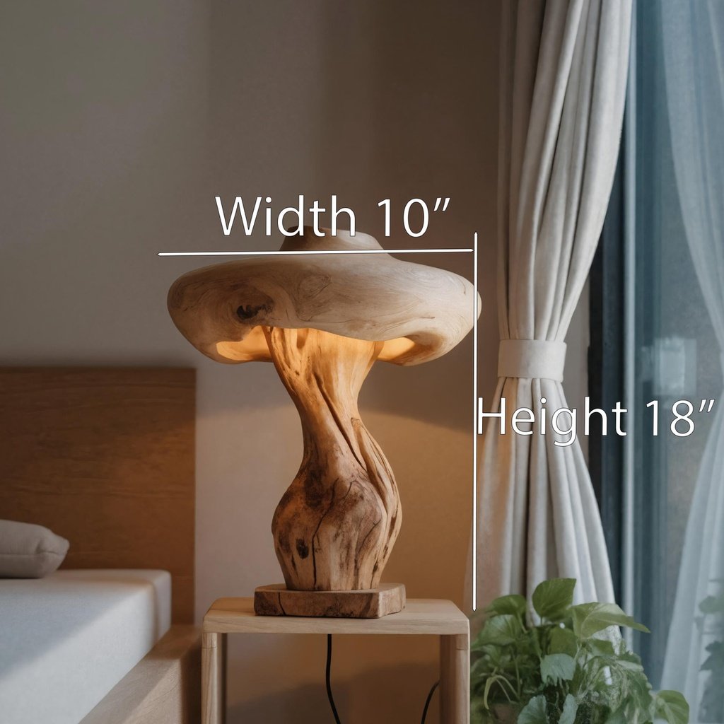 This lamp features a unique mushroom-inspired shape with smooth, flowing lines. Made from natural wood, its form highlights the raw elegance of the material. The warm light it emits creates a cozy and inviting atmosphere, perfect for any setting in your home.