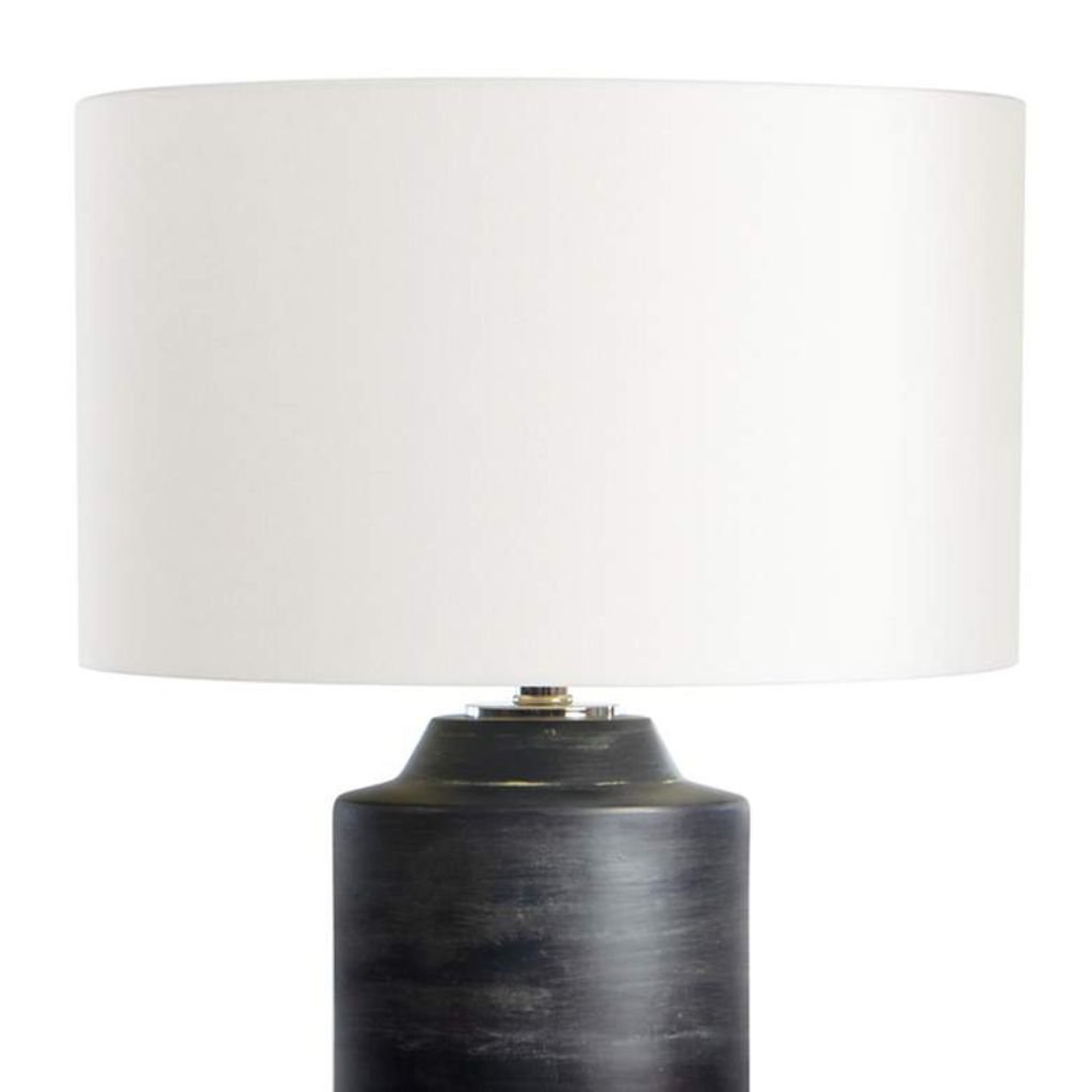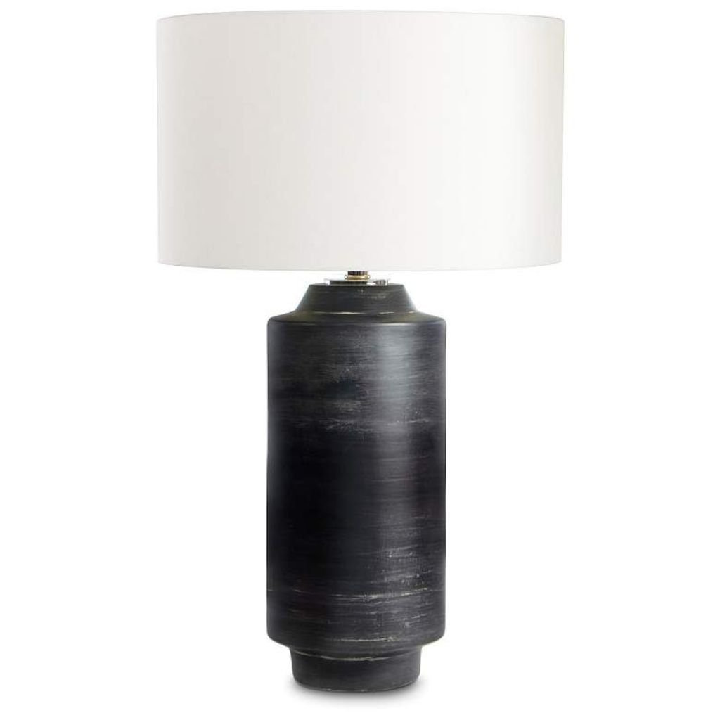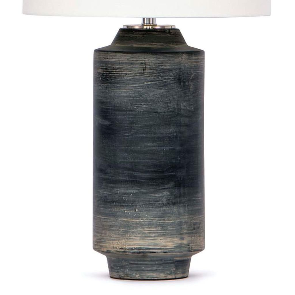 The hand-applied glaze creates subtle variations in tone and pattern, ensuring each lamp has its own distinctive character. Ebony blacks, layered grays, muted blues, and soft tans blend together to create depth and visual movement. The crisp white linen shade balances the richly glazed base, softly diffusing light for a warm, welcoming glow.