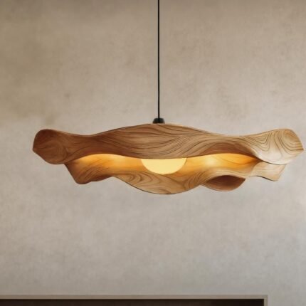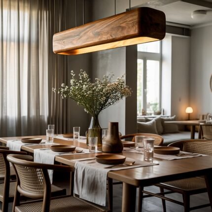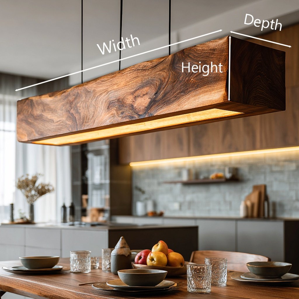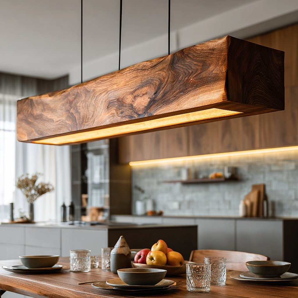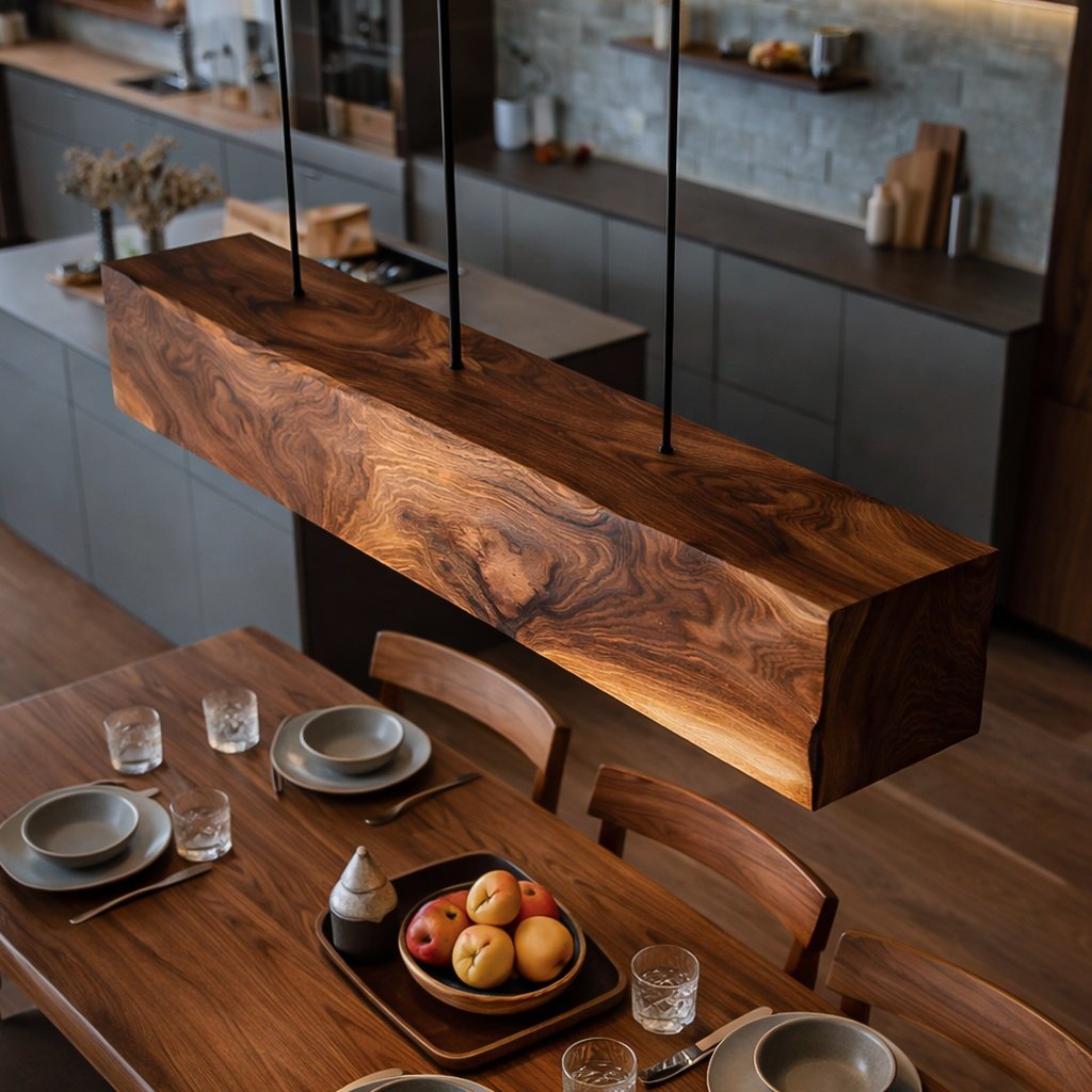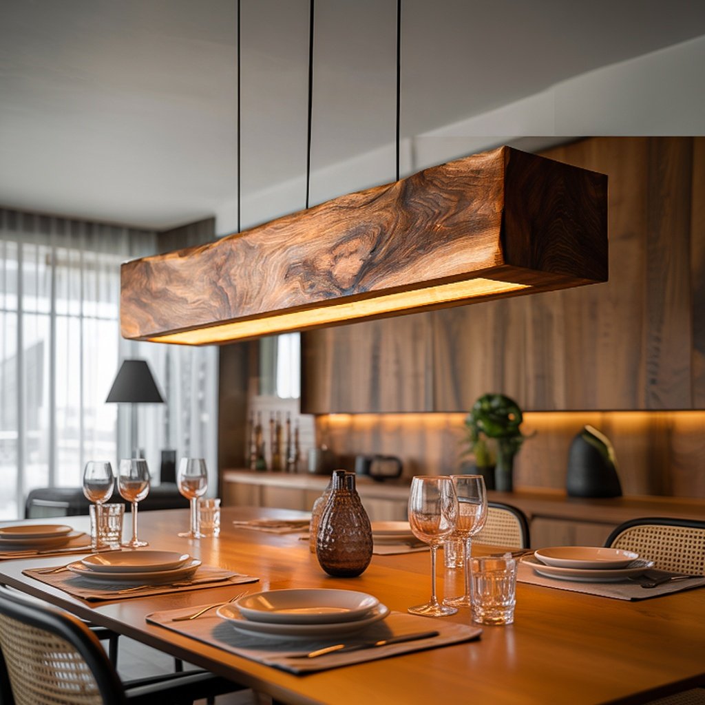 This pendant light is a blend of art and functionality. It features a solid rectangular wooden body suspended by slim, barely-there cables. The result? A floating effect that’s both striking and serene. The light source runs along the underside, casting a soft, even glow on the surface below. With its clean edges and natural wood grain, this piece balances structure with organic beauty.