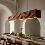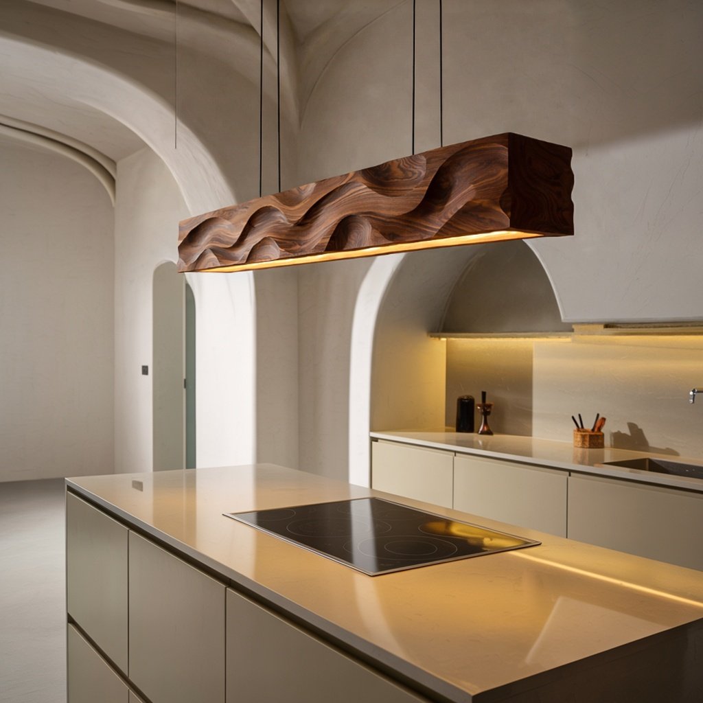 This isn’t just any light fixture. It’s a handcrafted piece with an elongated wooden body featuring a wave-carved surface that shows off the natural wood grain. The integrated lighting underneath casts a soft, focused glow, making your space feel warm and welcoming. Suspended by slim cables, it almost looks like it’s floating, adding a touch of modern elegance to your room.