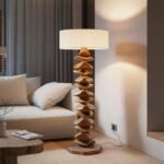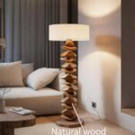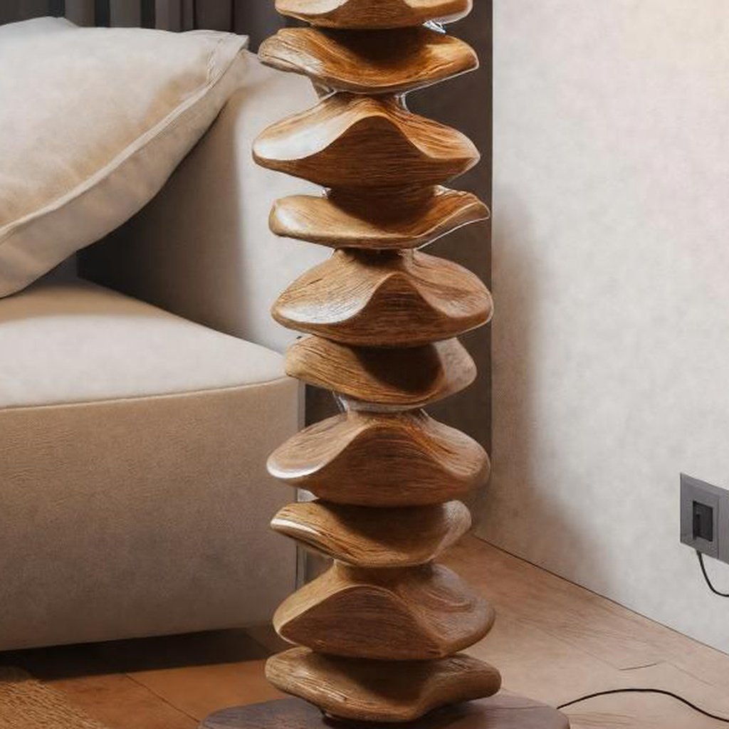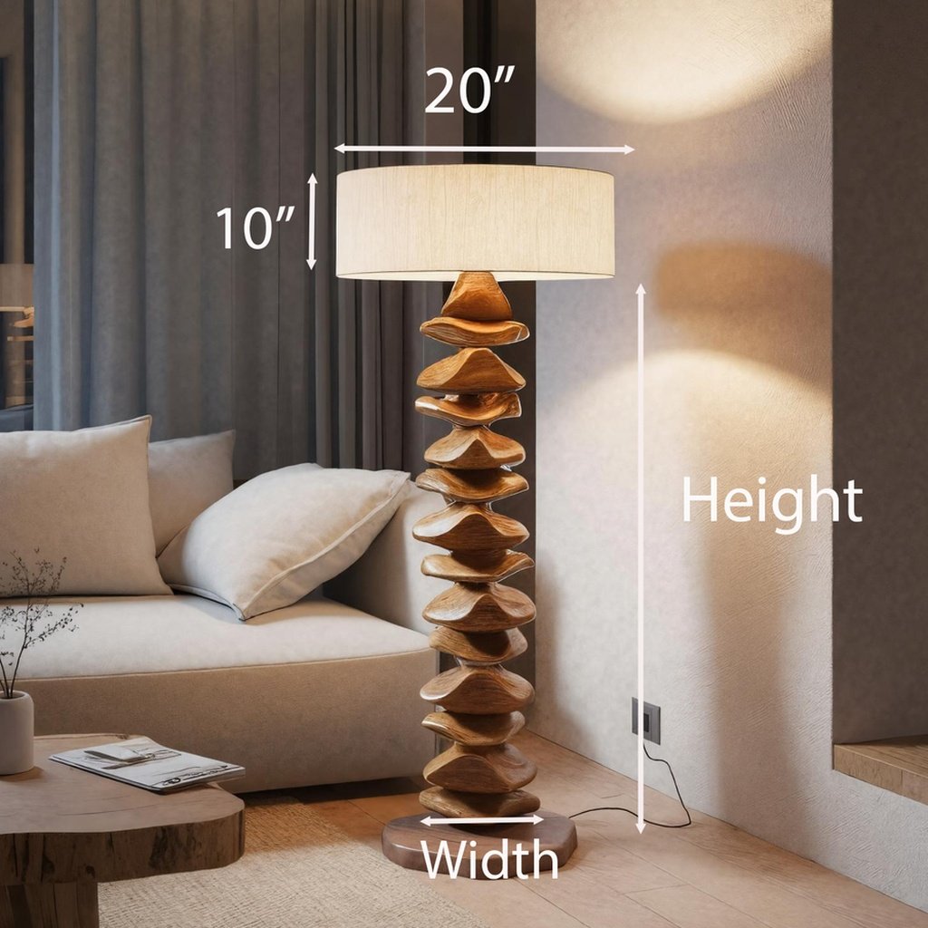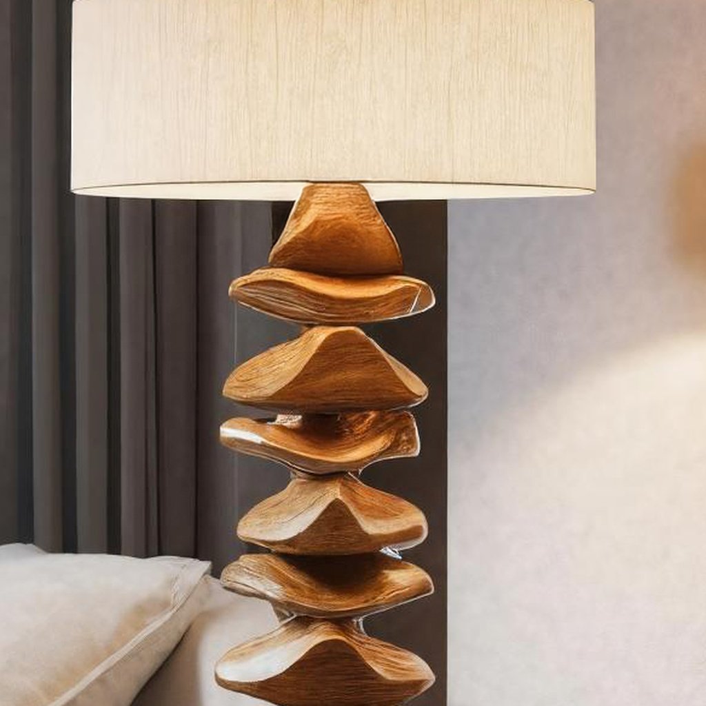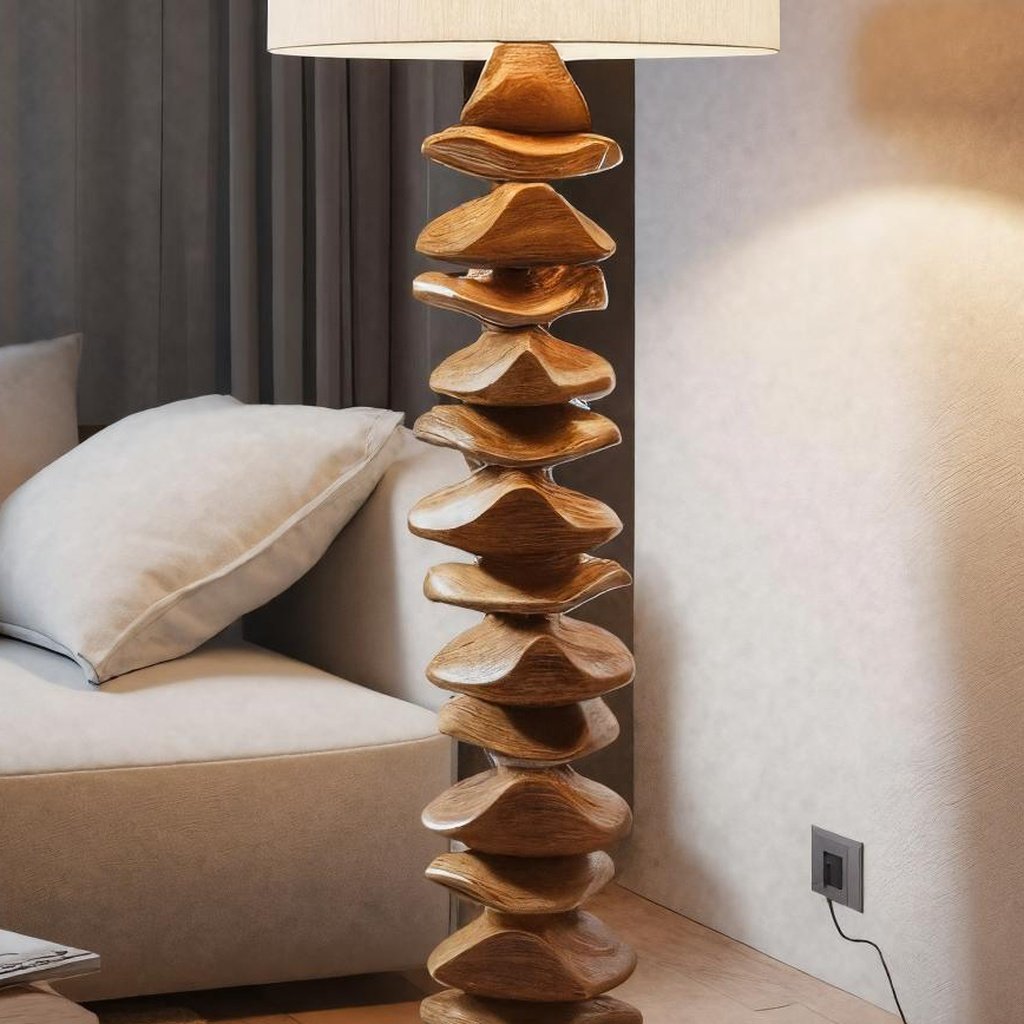 This floor lamp is a true masterpiece. Its hand-carved wooden base is full of intricate details that create a striking visual impact. The layered design gives it a bold yet elegant look. Topped with a soft fabric lampshade, it offers a warm, diffused glow that enhances any living room or lounge area.