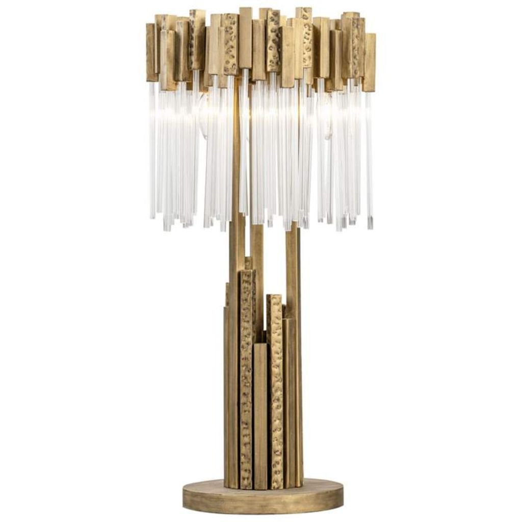 At 30 inches tall and nearly 30 pounds, the Matrix 3-Lt table lamp by Varaluz is not a lamp that disappears into a room. Its Havana gold finish catches light from every angle, and the three-bulb candelabra configuration gives it a structural presence that reads more like a sculptural object than a conventional lighting fixture. This modern table lamp is built for spaces that can hold a statement piece — a grand living room console, a foyer table, or a primary bedroom dresser where scale and finish matter as much as function. Varaluz has long worked at the intersection of art and lighting, and the Matrix is a clear expression of that sensibility.