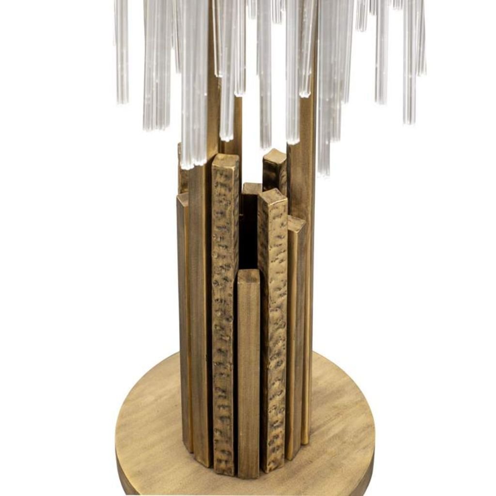 The Havana gold finish gives the Matrix lamp a warmth that separates it from cooler metallic tones — this is gold with depth and richness, not surface shimmer. The three-light configuration creates a layered visual rhythm, with each candelabra socket contributing to a composition that feels considered and deliberate. At 14 inches wide, the base is proportioned to hold the lamp’s considerable 29.6-pound frame with stability, and the overall silhouette is bold enough to serve as a room’s focal point without requiring anything around it to compete. It suits interiors that lean modern, glam, or transitional — spaces where a strong finish and confident form are welcome.