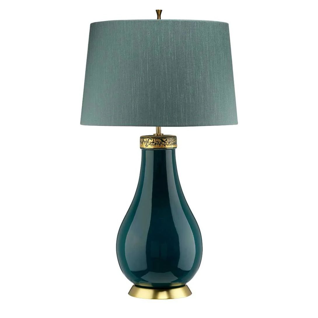 Add a bold yet elegant accent to your interior with the Quintiesse Havering Table Lamp, a striking blend of color, craftsmanship, and timeless charm. With its vibrant azure-turquoise ceramic base and aged brass detailing, this piece radiates character and warmth—perfect for refreshing your living space.