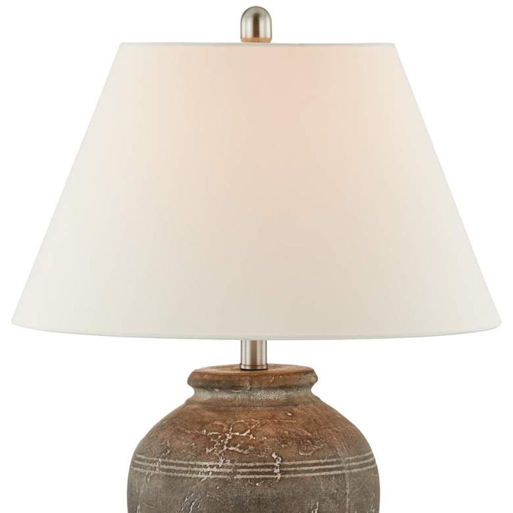The wide fabric shade — 18 inches at the base and 11 inches high — diffuses light broadly and evenly, making the Kellen well suited to larger room arrangements where a single lamp needs to carry meaningful ambient output. The 3-way on-off socket switch on the neck puts brightness control within easy reach, allowing the lamp to move between three light levels without requiring a separate dimmer. At lower settings, the brown and gray tones of the ceramic base deepen visually, leaning into the lamp’s rustic character and creating a warm, intimate atmosphere suited to evening use.