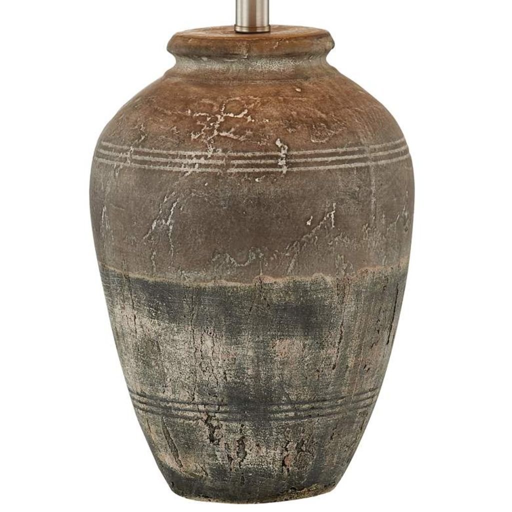 Forty West designed the Kellen lamp around the visual language of artisan pottery — organic form, earth tones, and a surface finish that rewards close attention. The brown and gray hues work across the ceramic body in a way that feels hand-finished rather than uniform, giving the lamp a tactile depth that distinguishes it from mass-produced alternatives. The vase silhouette is generous and grounded, with a wide body that tapers toward the neck in a classically proportioned curve. The white fabric shade echoes the neutrality of natural linen, broad enough at the base to spread light widely while keeping the palette restrained and cohesive throughout.