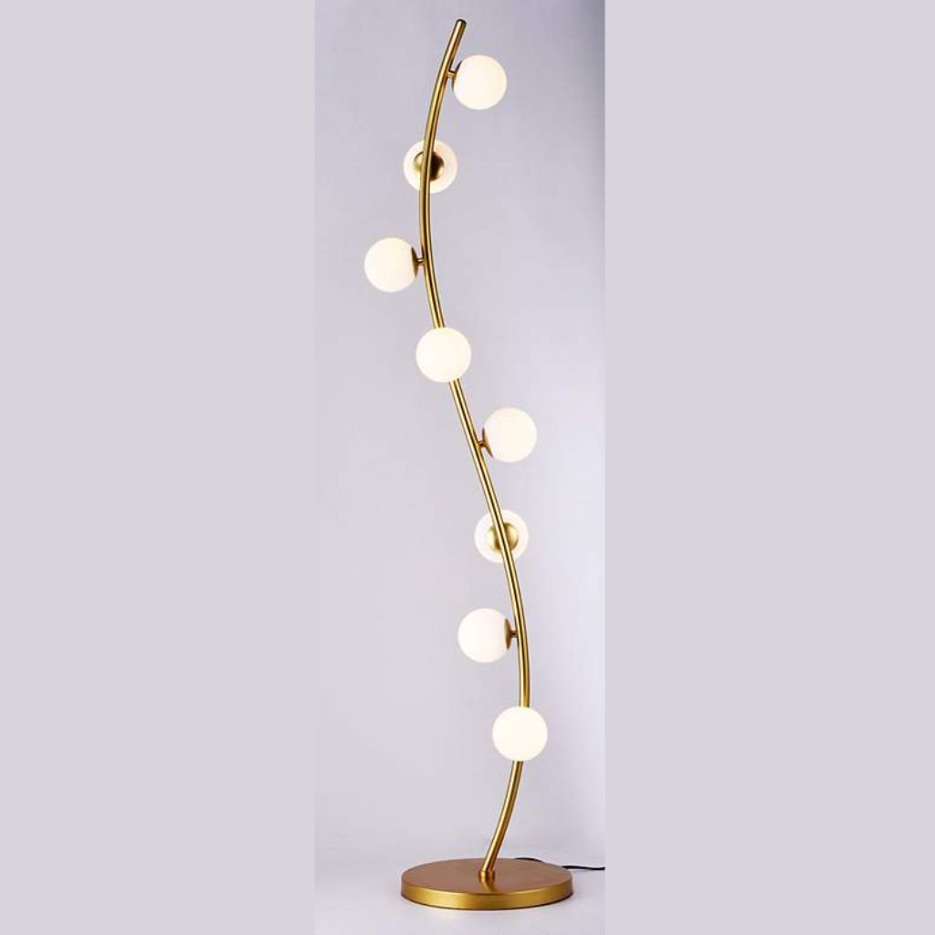 The Rover Floor Lamp from the ET2 Lighting brand is a striking modern design that blends sculptural form with efficient illumination. Created to deliver bright, even lighting throughout living rooms and seating areas, this lamp features a graceful wave-shaped base finished in warm gold for a refined, contemporary look. Eight integrated LED lights are arranged vertically along the slim metal pole, each topped with a white glass globe that softens the light and adds visual balance. The result is a bold yet elegant floor lamp that functions as both a lighting solution and an artistic statement piece.