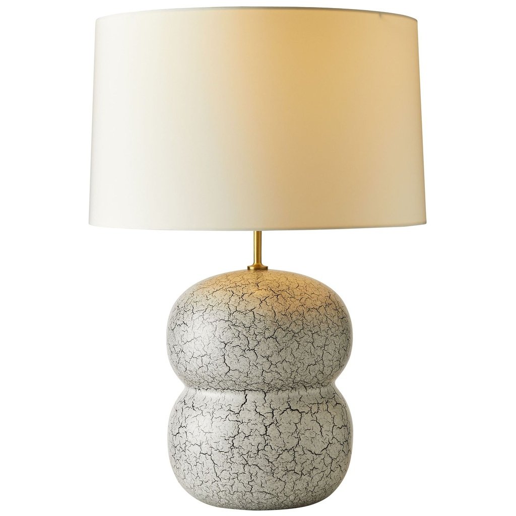The sculptural base on this ceramic table lamp is the focal point — a form built to hold attention before the light even turns on. The platinum crackle finish over ceramic creates a surface that catches light in irregular patterns, producing constant visual movement and depth. Platinum is cooler and more sophisticated than silver or chrome, and here it works particularly well against the crackle texture. The tan linen shade keeps the top half understated, directing attention to the base where all the design interest lives. The crackle glaze adds handcrafted depth that a plain glazed ceramic simply cannot match.