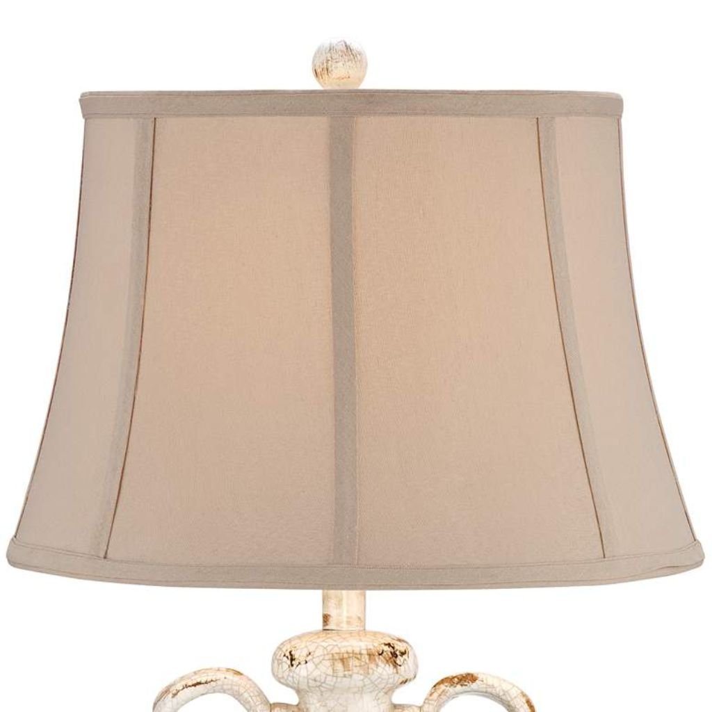 The handcrafted ceramic jar base carries the deliberate imperfection that only genuine hand production introduces — slight variations in the ivory crackle finish, the rope-like neck detailing, and the overall profile ensure that each lamp is a unique object rather than a replicated unit. The crackled farmhouse ivory glaze sits over the ceramic with the warm, slightly aged quality that crackle finishing produces — fine surface fissuring distributed across the ivory ground in a pattern that reads as naturally weathered and authentically rustic without appearing distressed or damaged. Rope-like detailing at the neck adds a textural accent that reinforces the lamp’s farmhouse character with a material reference to natural fiber without the fragility of actual rope application. The beige bell shade with vertical ribbing introduces a second layer of surface texture above the ceramic base — the ribbing catching light along each raised line and giving the shade a dimensional quality that smooth bell shades lack.
