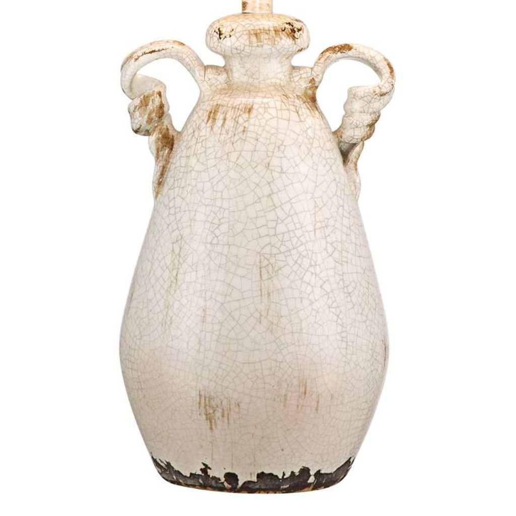 At 27 inches tall overall, this lamp is proportioned for nightstands, side tables, and farmhouse console surfaces where a lamp of warm, handcrafted presence is needed at a scale that suits casual, country-inspired room arrangements. The ceramic base widens to 12 inches at its middle before tapering to a 6-inch wide bottom — the jar silhouette’s characteristic swelling form providing generous surface area for the crackled ivory glaze and rope neck detail to read at full effect. The beige bell shade spans 12 inches across the top and 16 inches across the bottom with a 10.5-inch height, a tapered profile that complements the jar base’s rounded form with proportional harmony. Because the base is handmade, slight variations in color and height are inherent to each piece — a characteristic that reinforces the lamp’s rustic, artisan credentials rather than representing a manufacturing limitation.