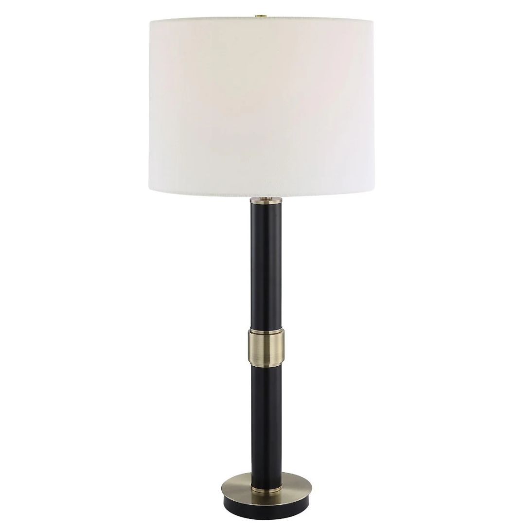The Keiichi Leonard Table Lamp is a masterclass in refined simplicity, making it a standout piece for both modern and traditional interiors. With a statuesque 81cm height, this lamp features a sleek metal body in matte black, accented with subtle antique gold detailing for a touch of luxury and depth.