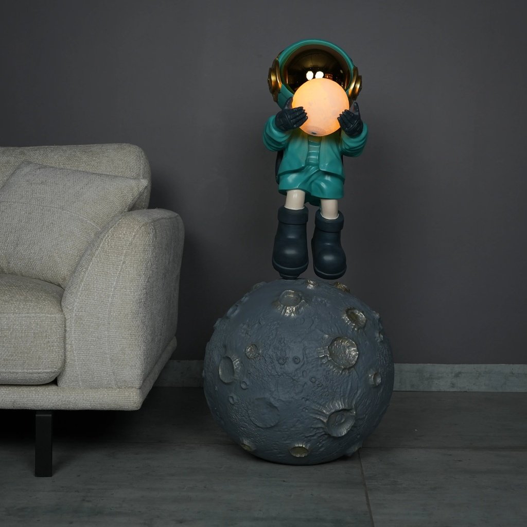 The Lunar Guardian Astronaut Lamp is more than just a lighting solution; it’s a sculptural masterpiece. The vibrant teal suit and commanding posture of the astronaut stand atop a detailed moon-textured base, creating a visual spectacle. This lamp is perfect for those who appreciate bold and imaginative decor, making it a standout piece in themed spaces, creative studios, and modern living areas.