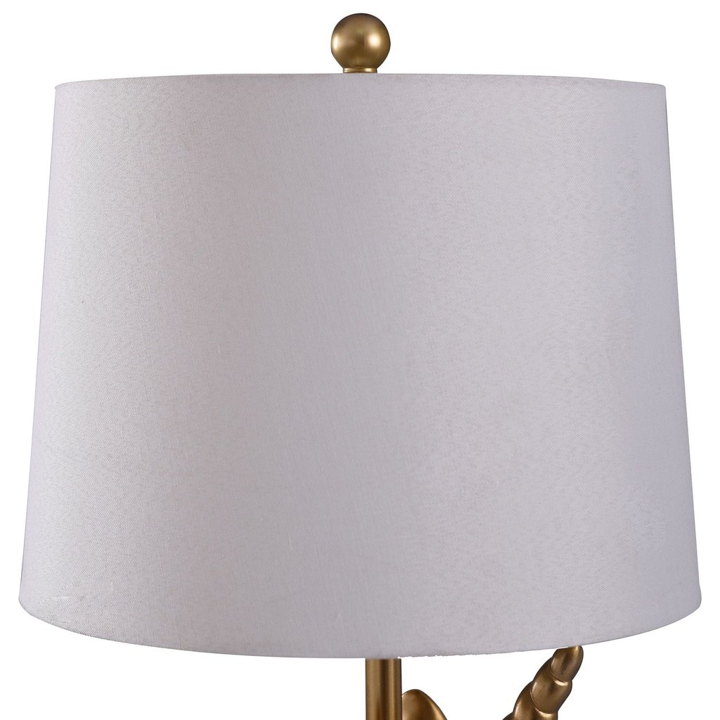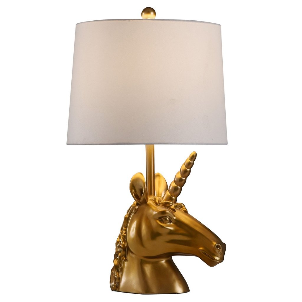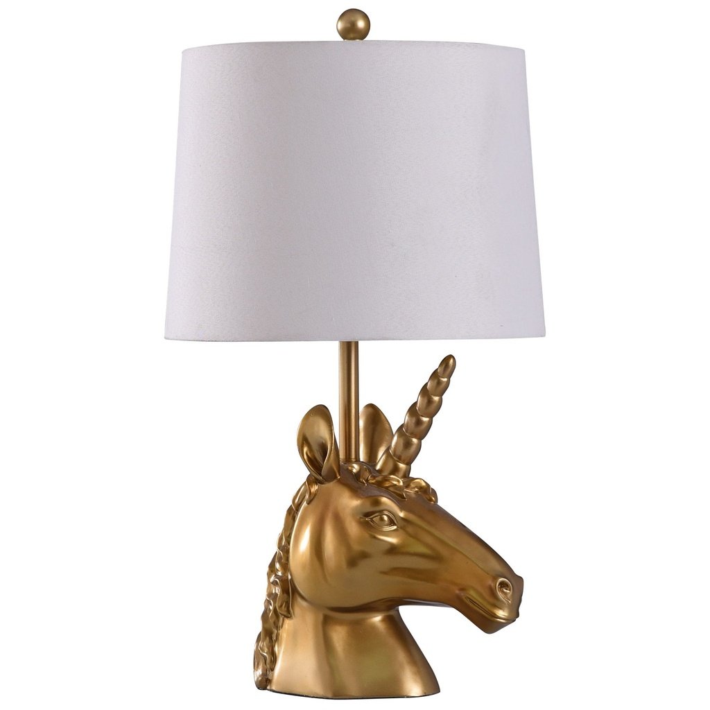 If you need a statement accent lamp that works in a playful or whimsical space, this one delivers without apology. A golden unicorn figure forms the entire lamp base — detailed, upright, and finished in warm gold against a white ground. It’s the kind of piece that reads as both decorative sculpture and functional lighting at the same time.