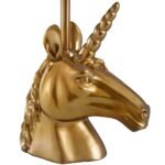 The unicorn base is the centerpiece here — cast with enough detail to stand out as a decorative object even when the lamp is off. The gold finish is warm and lustrous, catching light in a way that makes the figure feel alive and dynamic from different angles in the room.