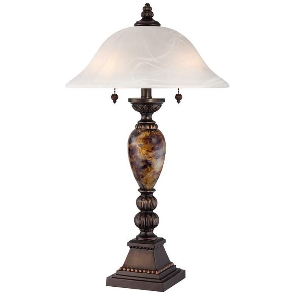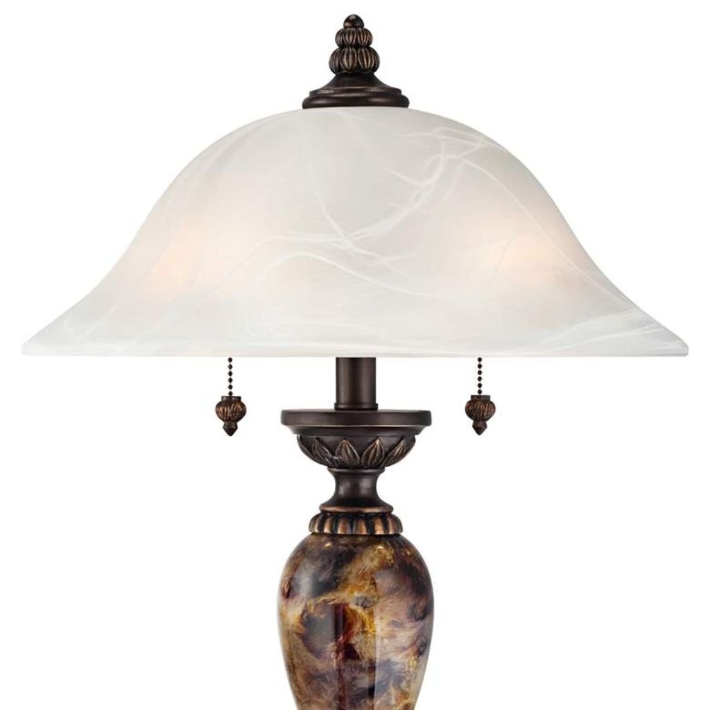 With its urn silhouette, marbleized finish, and glowing alabaster glass shade, this two-light table lamp delivers both decorative impact and practical illumination. It’s a refined addition that enhances traditional décor while offering modern lighting convenience.