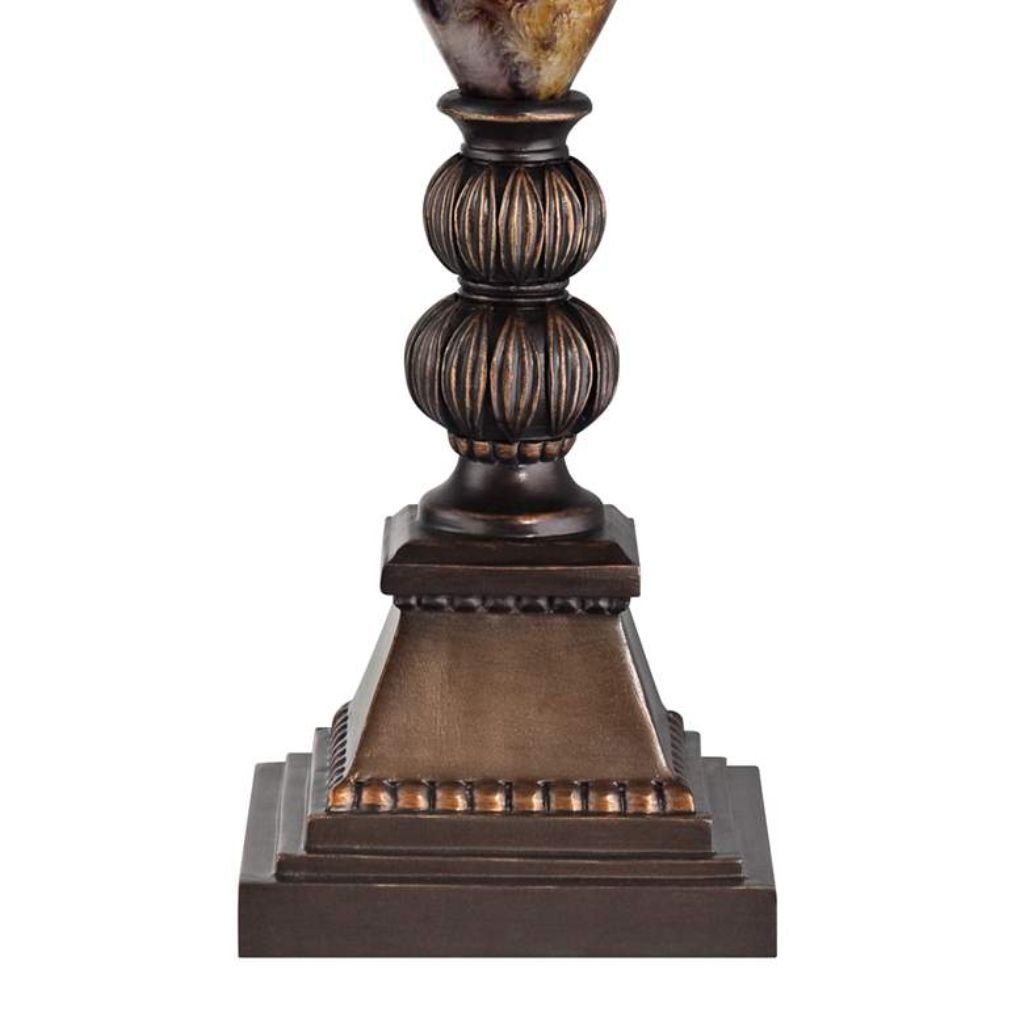 Standing 27 inches high overall, the lamp features a sculpted urn-shaped base crafted from durable cast resin. A marbleized finish in rich golden browns is complemented by aged bronze and gold detailing, giving the piece depth and an old-world aesthetic. Decorative carving enhances the classical silhouette, making it an eye-catching accent in traditional or transitional interiors.