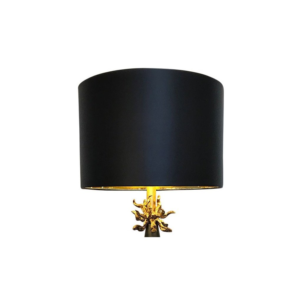• Materials: Black finish over steel construction. Gold leaf anemone and lampholder. Painted paper drum shade with gold leaf inside.