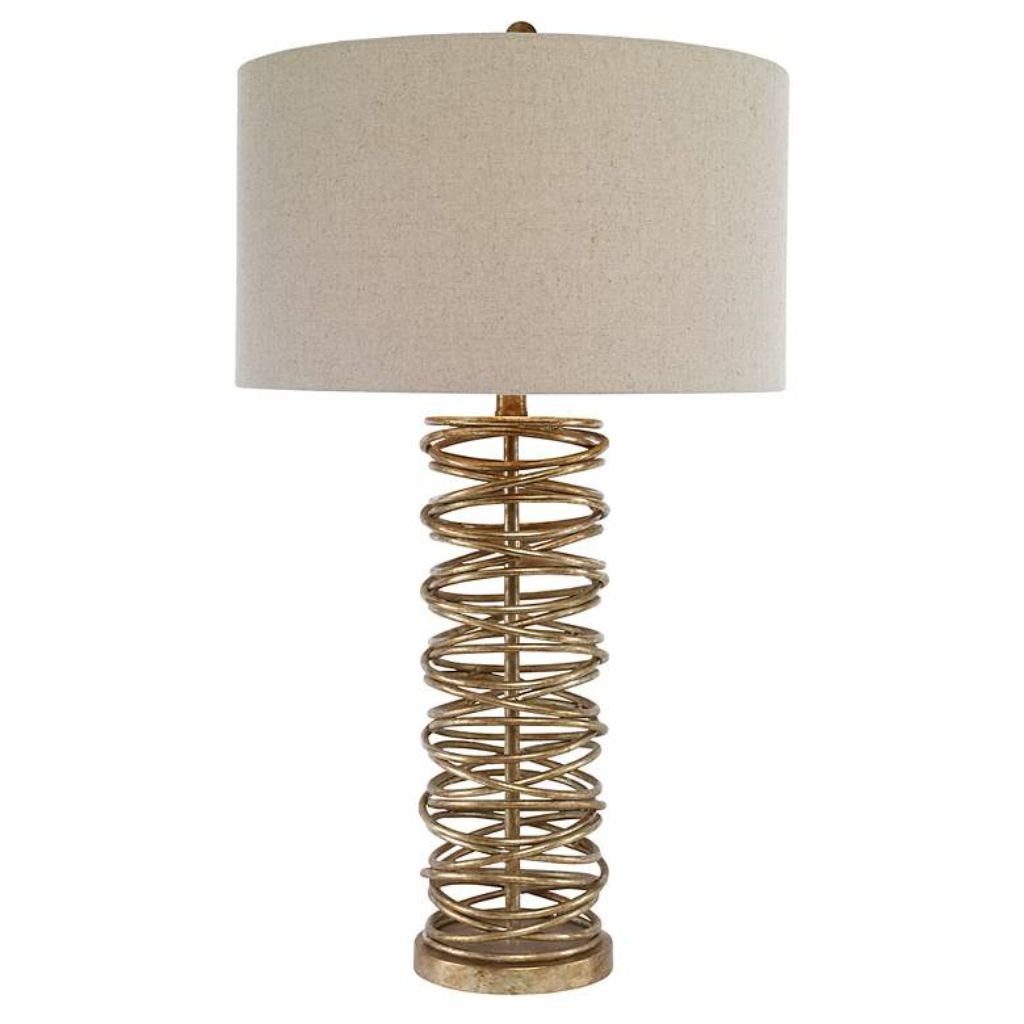 This table lamp features a metal open-ring column base in an antiqued silver champagne finish. The layered rings create visual depth and a dynamic, sculptural appearance. The metal construction ensures durability, while the 30-inch overall height gives the lamp a strong, balanced presence on side tables, consoles, or desks.