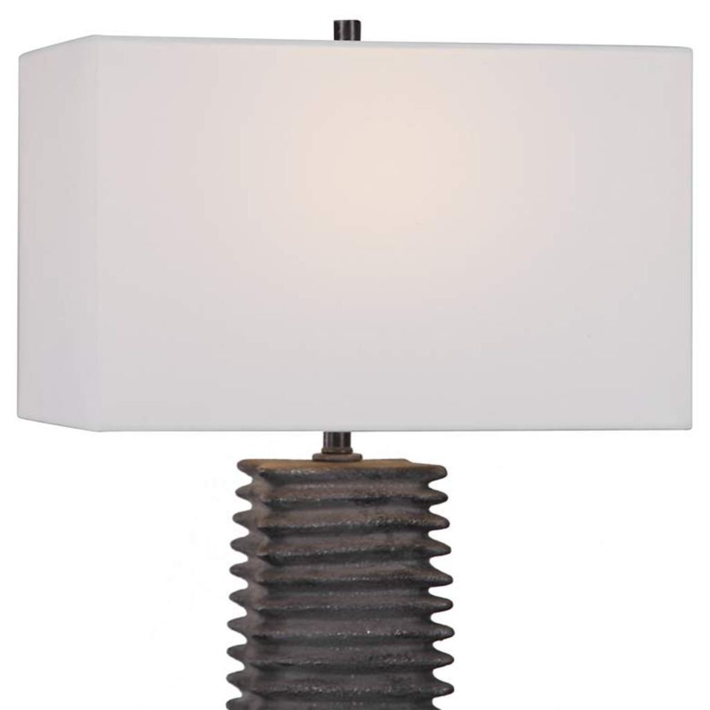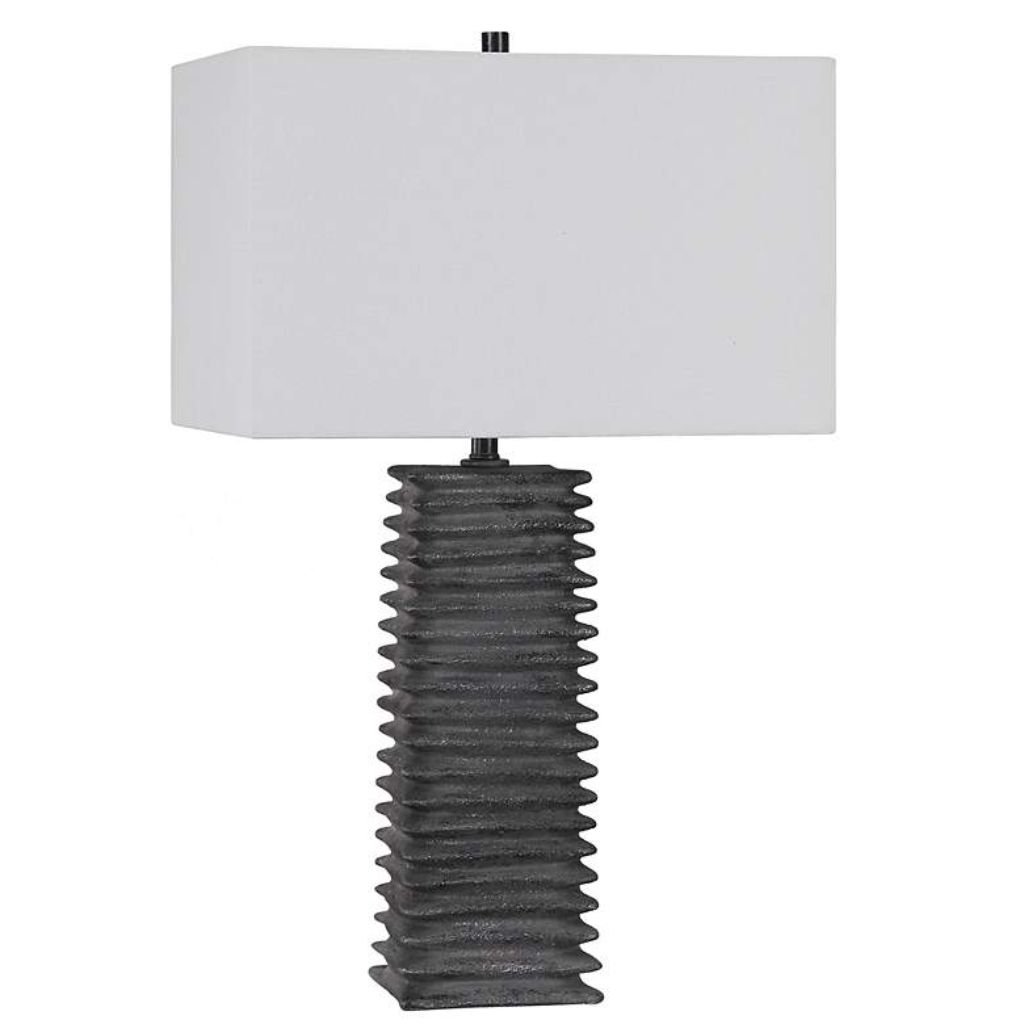 With its metallic charcoal ceramic base, deep ribbed pattern, and crisp white rectangle shade, the Sanderson Modern Ceramic Table Lamp delivers industrial-modern style and functional lighting for contemporary spaces.