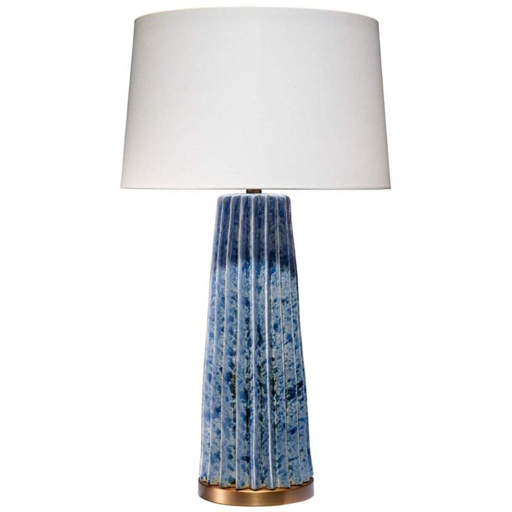 • Color/Finish: Hand-applied blue glaze, white linen tapered shade