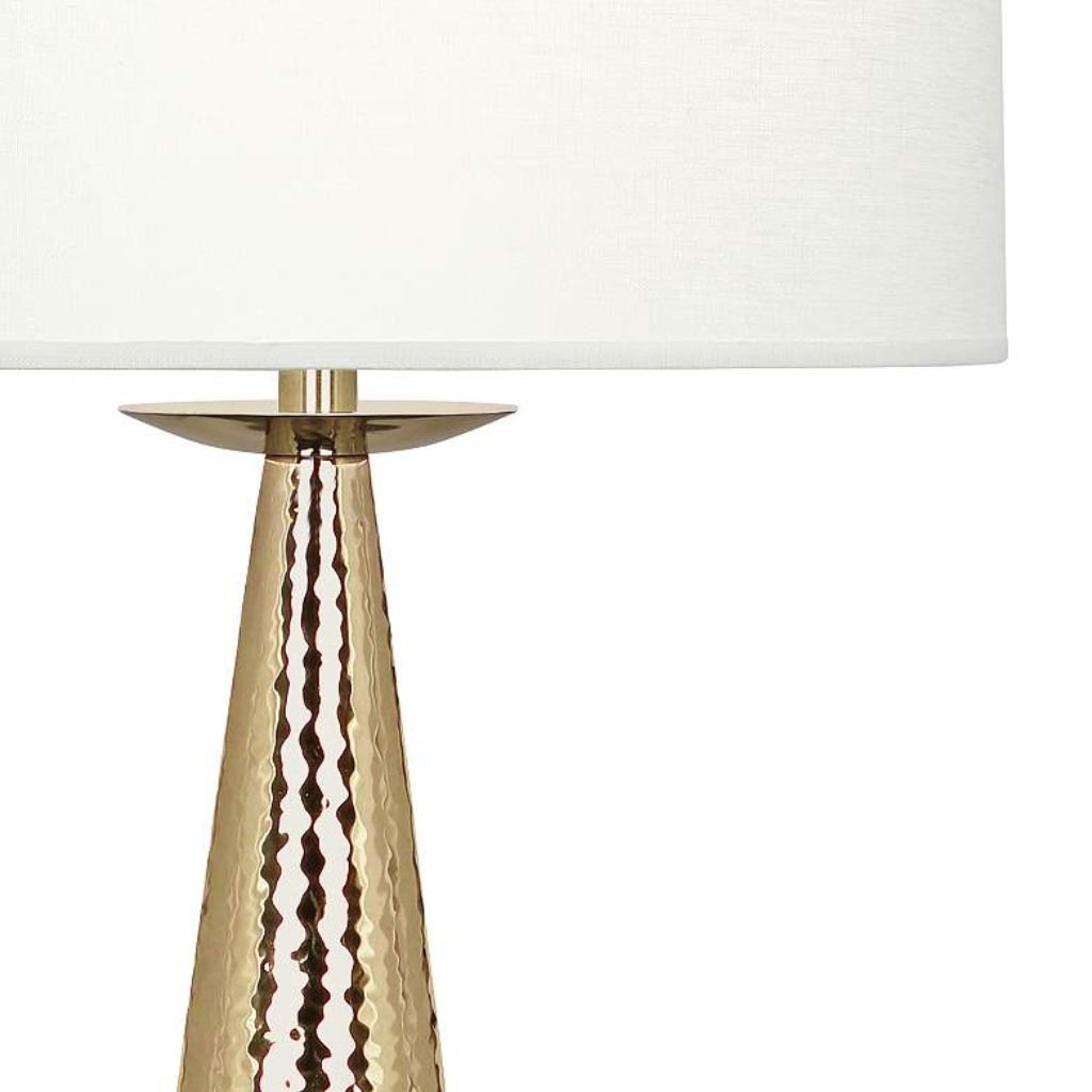 Lead with the material: hammered brass finish over metal construction — a surface treatment that introduces the organic, hand-worked texture of traditional metalsmithing into a lamp that is otherwise clean, contemporary, and entirely resolved in its proportions. The Dal modern brass column table lamp by Robert Abbey rises 30.5 inches in a column form that earns its presence through material quality rather than silhouette complexity. The hammered finish catches ambient light across thousands of small faceted impressions across the metal surface, creating a base that reads as warm and animated rather than flat and reflective — a distinction that separates hammered metalwork from polished or brushed alternatives in any lighting condition. An oyster linen fabric shade completes the lamp with natural, shell-toned warmth above the brass column, and a hi-lo dimmer at the socket provides immediate, two-stage brightness control without the need for a separate dimmer or smart bulb.