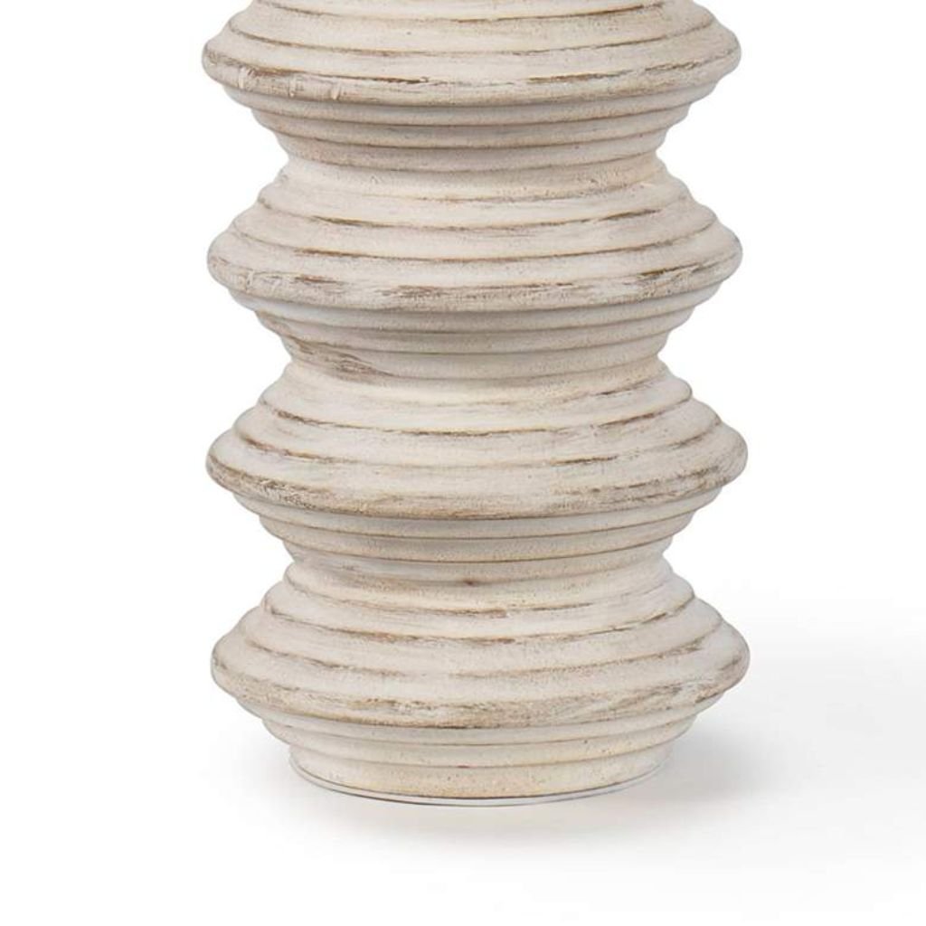 The birch wood base features carved ridge detailing that runs along its surface, adding depth and shadow to the overall form. The distressed white-washed finish accentuates the natural grain and carving, giving each lamp a slightly organic, handcrafted character.