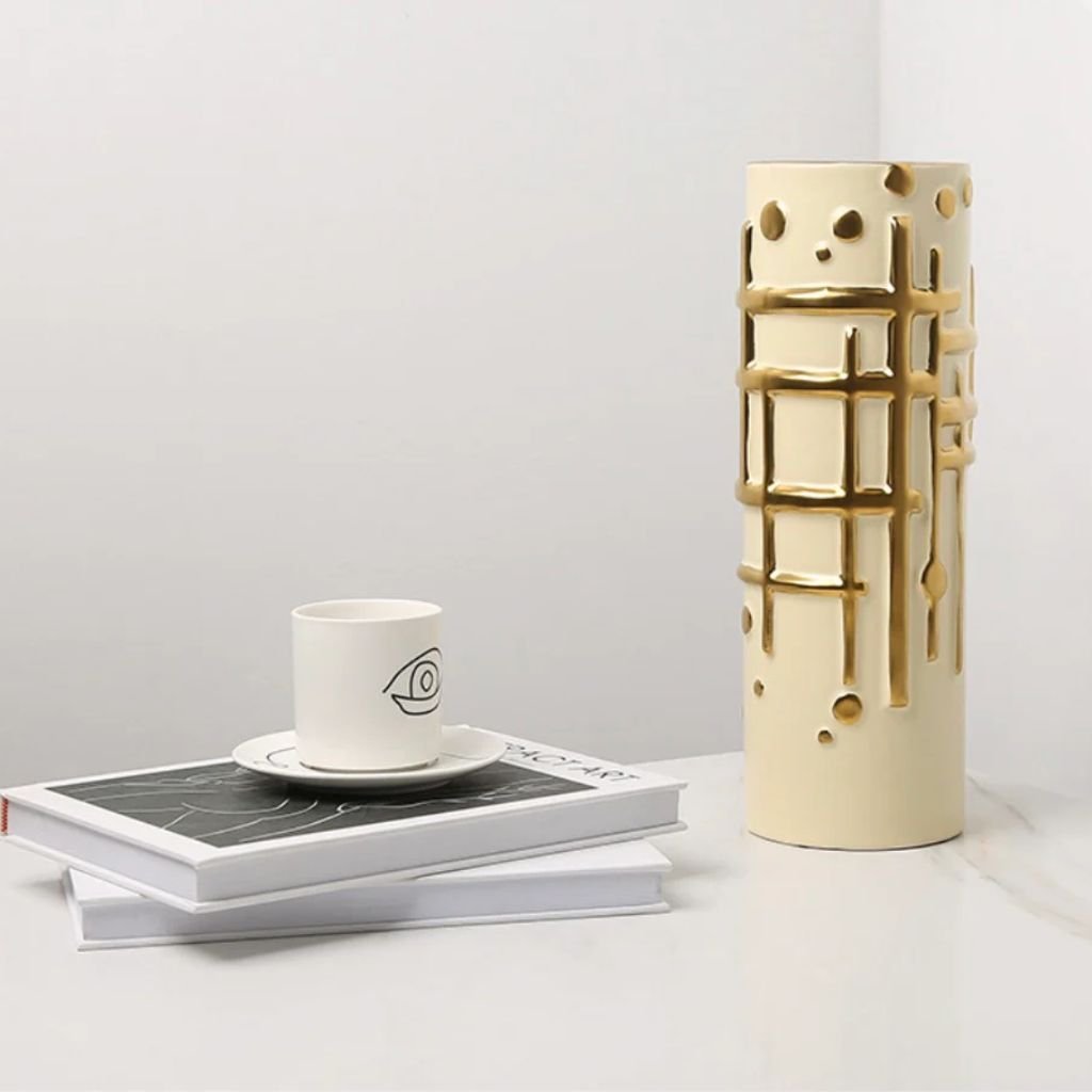 The design here is straightforward — a tall cylindrical body paired with structured grid-inspired embossing that adds depth and architectural character to any surface. Crafted from ceramic, this relief vase is available in two sizes and three finishes, making it adaptable across a wide range of interior styling contexts.
