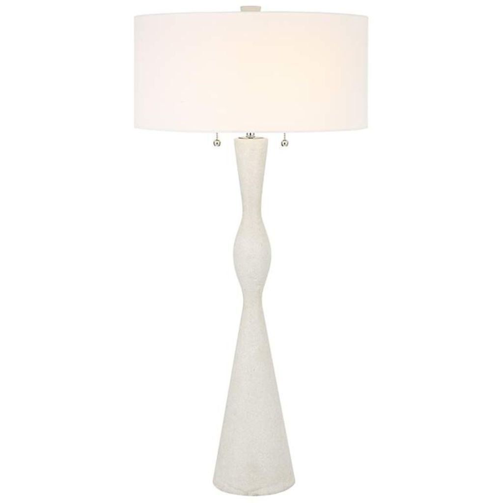 The Sharma Mid-Century Modern Stone Table Lamp from the Uttermost Sharma collection is a striking two-light accent that combines timeless design with functional elegance. Its slender hourglass-inspired silhouette, polished details, and soft linen shade make this table lamp a versatile addition to modern, transitional, or Mid-Century interiors.