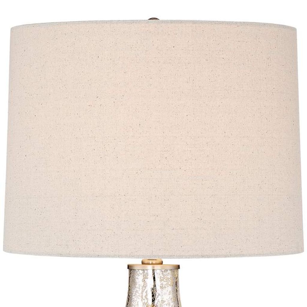 Each lamp is topped with an off-white tapered drum shade that softly diffuses light while complementing the shimmering glass base. The neutral tone balances the reflective finish, creating a look that is both eye-catching and refined.