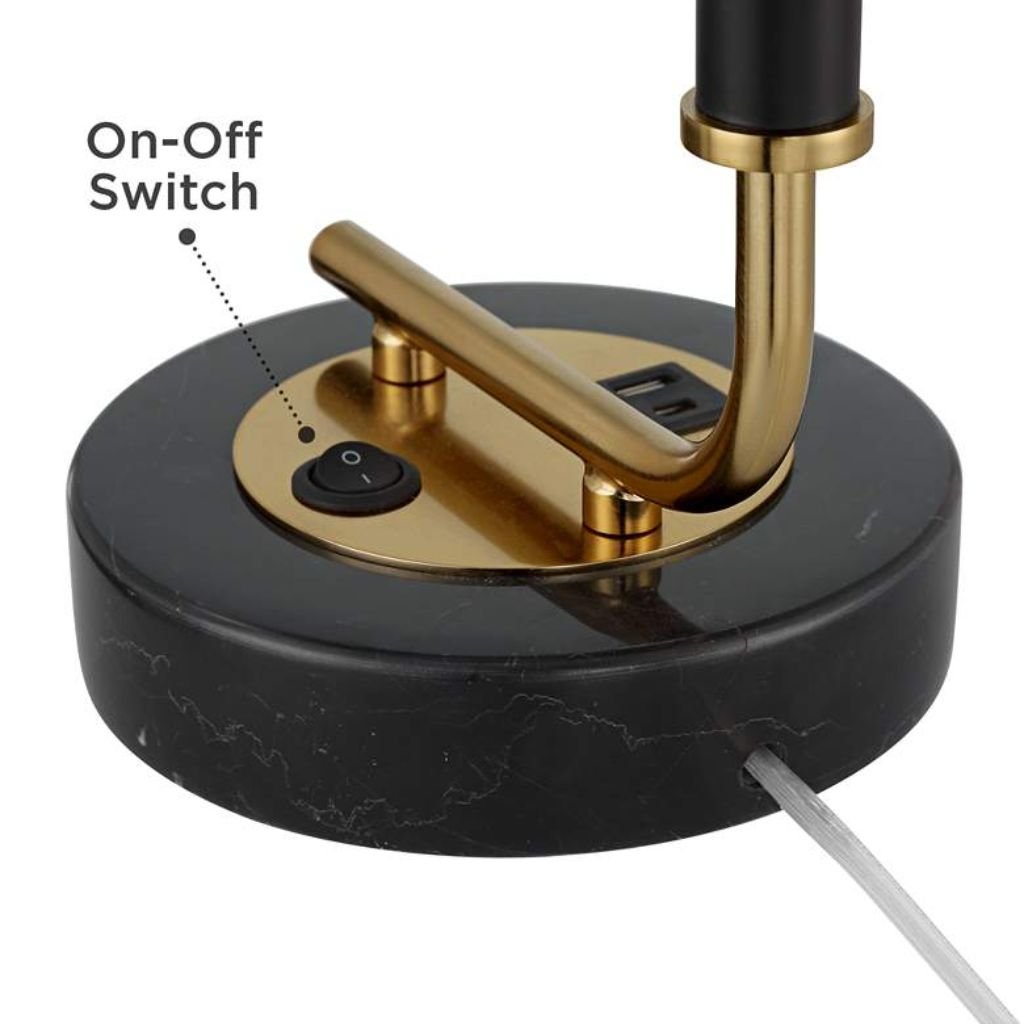 On a desk, nightstand, or side table, the right lamp changes everything — and this one changes two things at once. The modern marble desk lamp from Possini Euro Design pairs a genuine black marble base with black and gold metal construction, producing a lamp that reads as both a lighting fixture and a considered design object. What separates it functionally is the dual USB charging station built directly into the base — one Type-A port and one Type-C — eliminating the need for a separate charger on any surface where this lamp sits. The black finish drum shade keeps the silhouette tight and directional, and at 24 inches tall, the lamp occupies its space with precision rather than volume. This is desk lamp design that treats utility and aesthetics as inseparable.