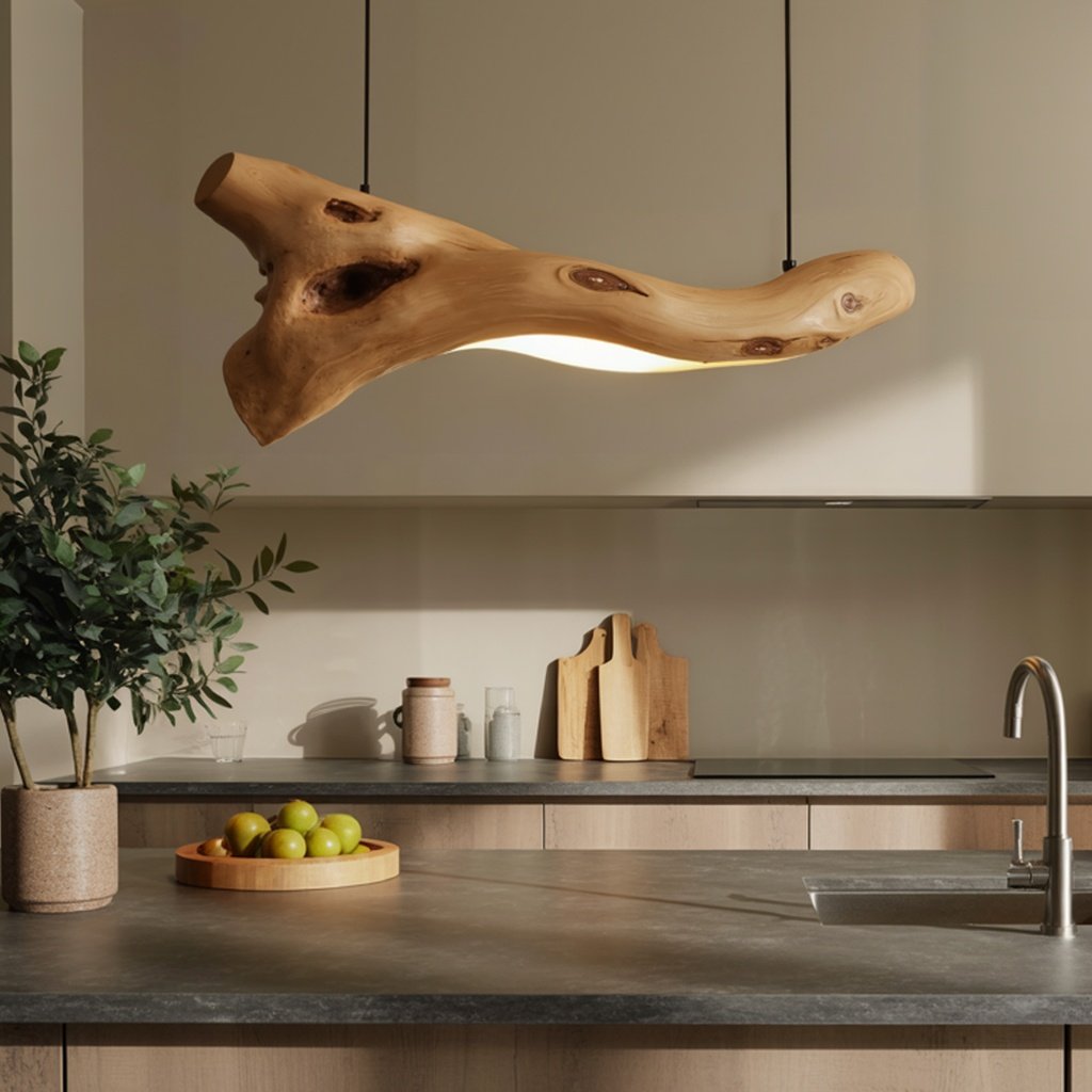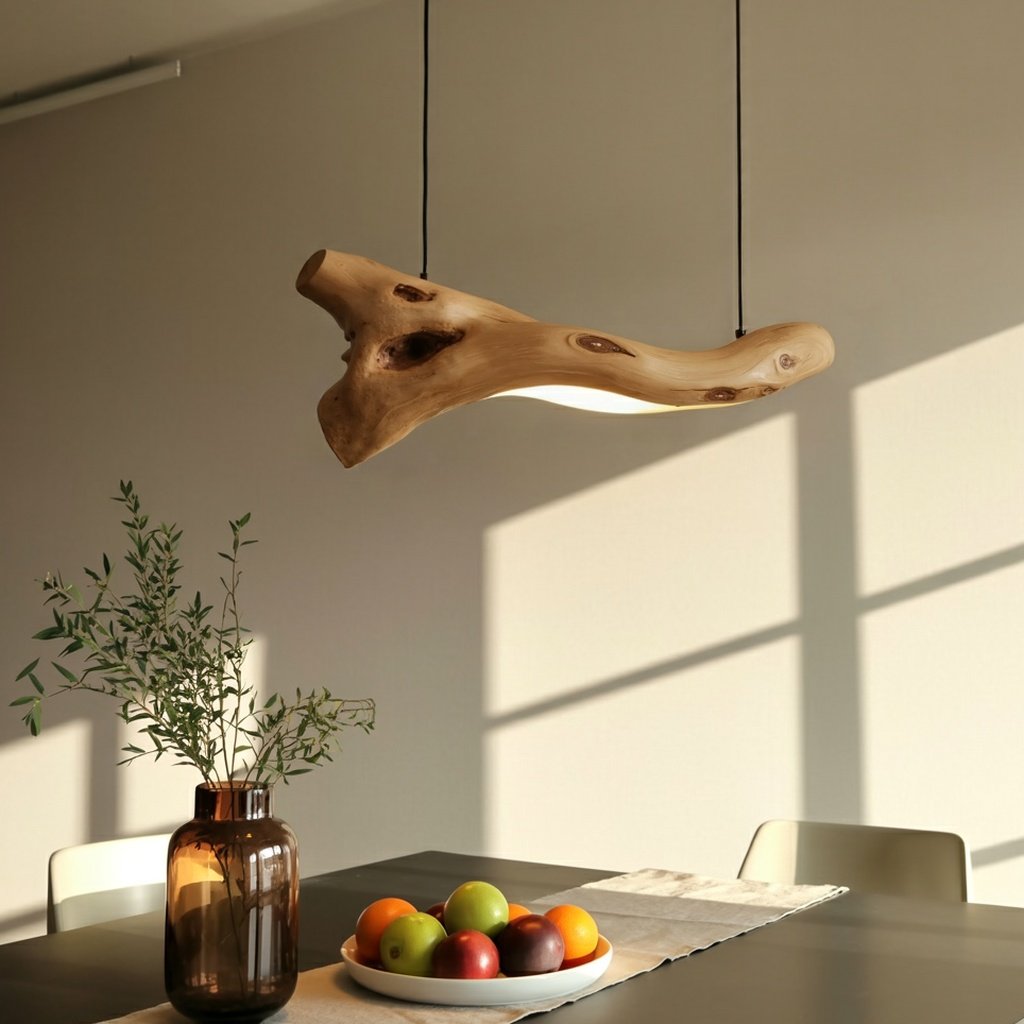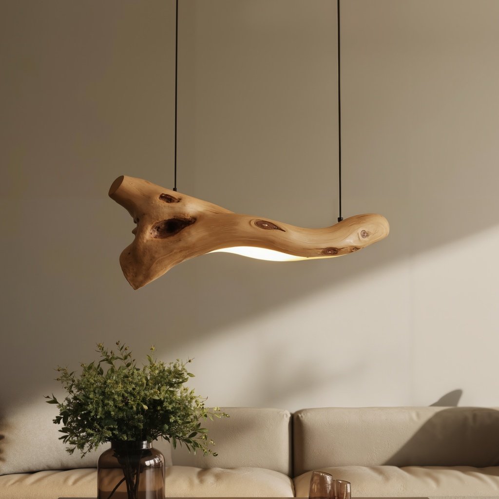This pendant light takes inspiration from the natural beauty of tree branches. It features smooth curves and live edge details that highlight the unique character of the wood. The minimalist suspension blends seamlessly into any setting, and the soft lighting casts a welcoming glow ideal for cozy evenings or lively gatherings.