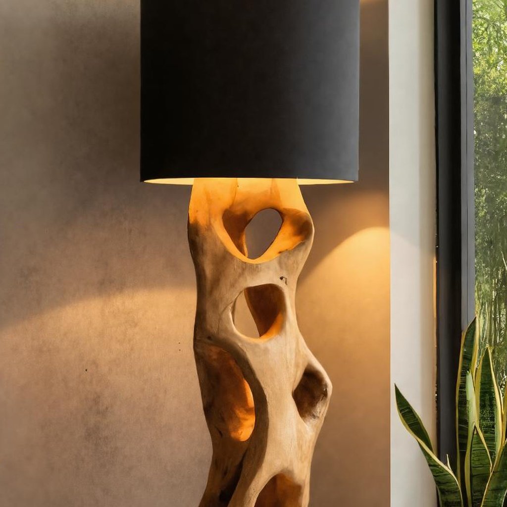 The lamp stands out with its carved wooden base and sculptural cutouts. These features create an intriguing play of light and shadow, adding a dynamic feel to any room. Its sleek lampshade complements the artistic base, giving you both style and function. Whether in a modern living room or a more creative space, this lamp fits right in.