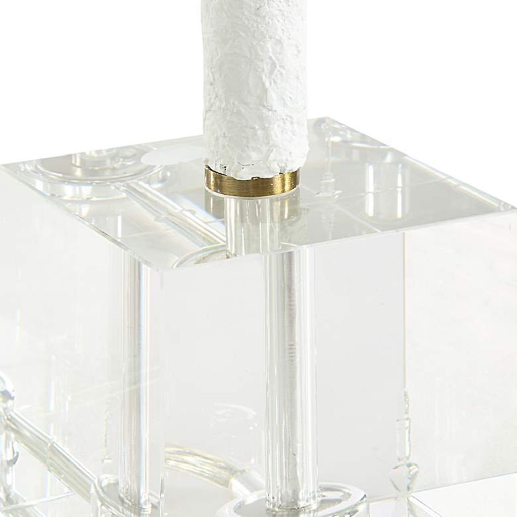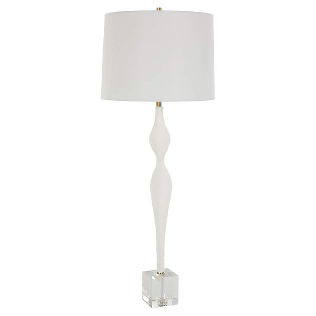 Standing 36 inches tall with a slender 3 1/2-inch-wide base, the Helena lamp features a ceramic construction finished in matte white. Its gently curving, organic silhouette creates a refined and airy look, while a square crystal accent at the bottom adds subtle glamour. The base is designed to command attention without overwhelming your décor.