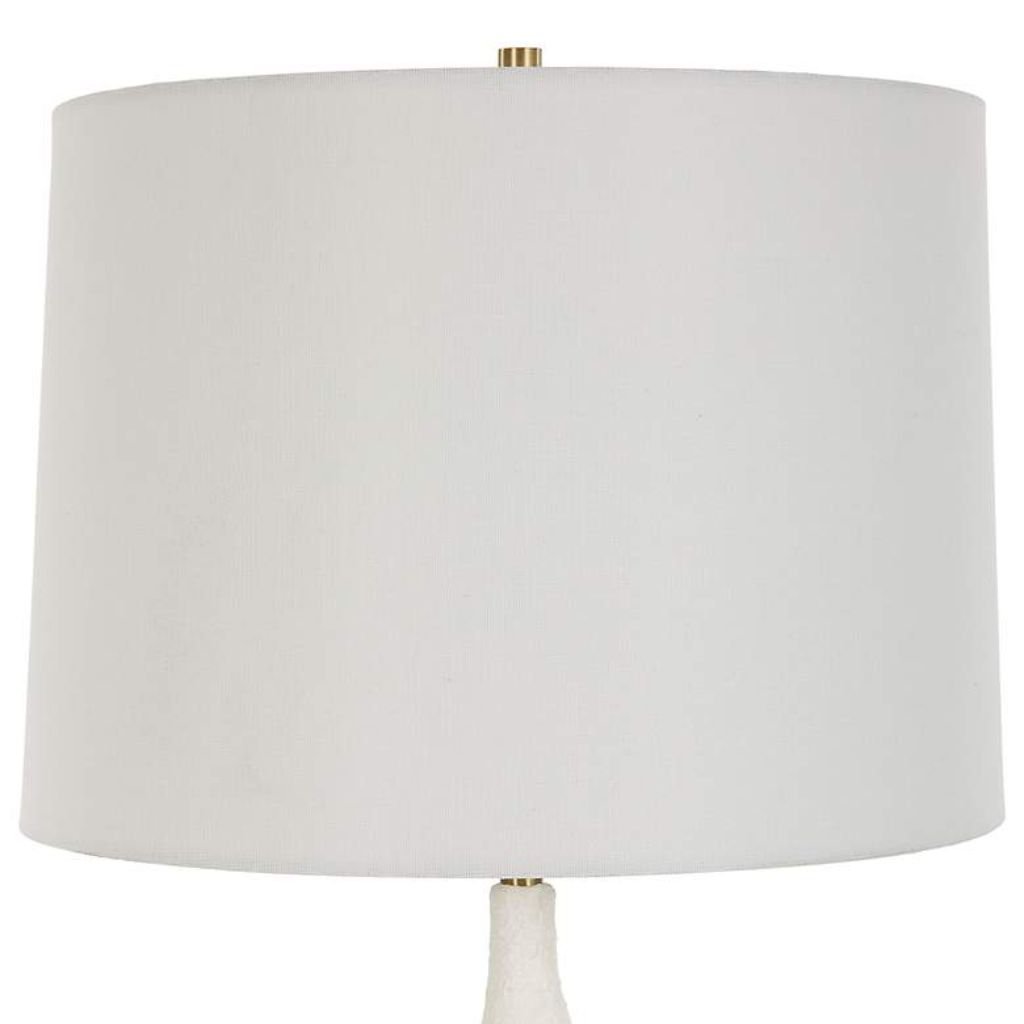 The lamp is topped with a white linen fabric shade measuring 14 inches across the top and bottom by 10 inches high. This shade softly diffuses light, creating a warm and inviting ambiance that complements both modern and transitional interiors. The clean, neutral color allows the sculptural base to remain the focal point of the design.