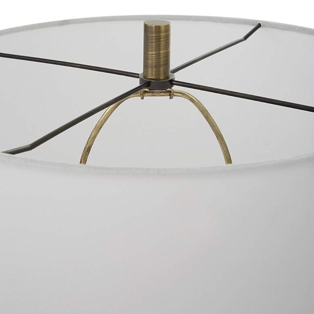 Topping the sculptural base is a white linen fabric drum shade measuring 14 inches across the top, 15 inches across the bottom, and 10 inches high. The neutral fabric softens and diffuses light evenly, casting a warm, ambient glow that enhances the mood of any space.