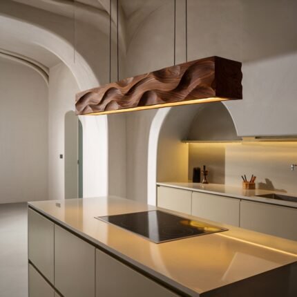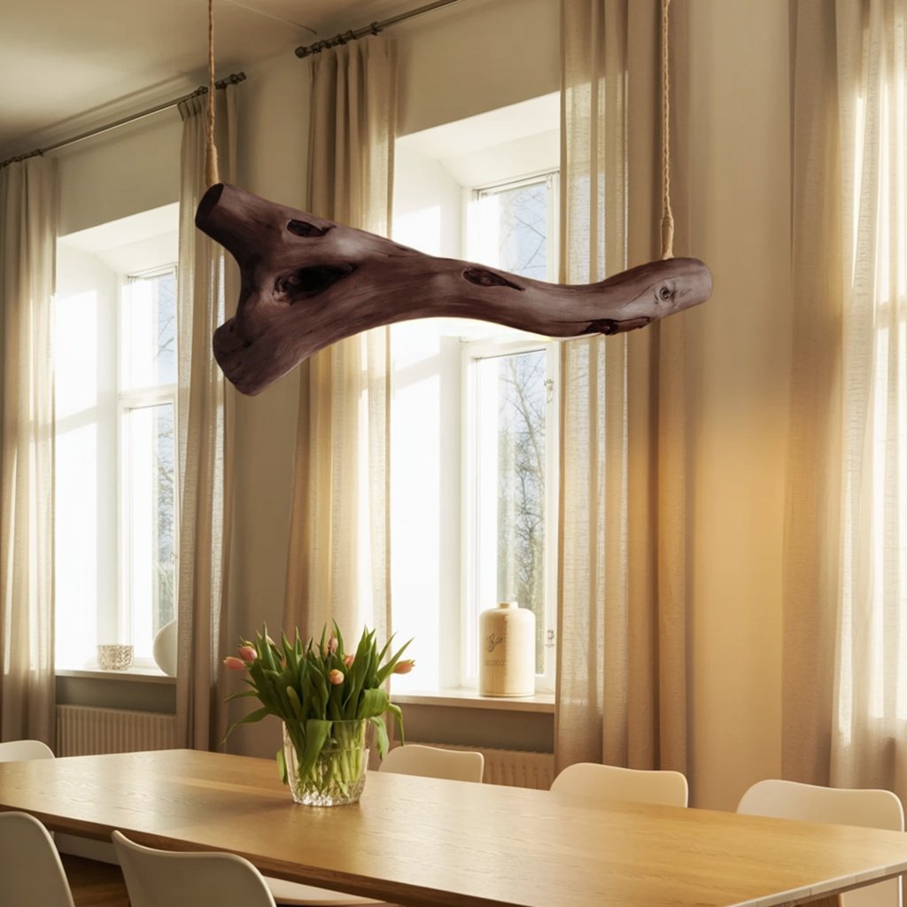 This pendant light captures the elegance of a natural tree branch, creating a sleek, suspended silhouette. The smooth curves and intricate details of the wood are highlighted by its minimalist design. It emits a soft, welcoming glow—ideal for both cozy corners and open spaces.