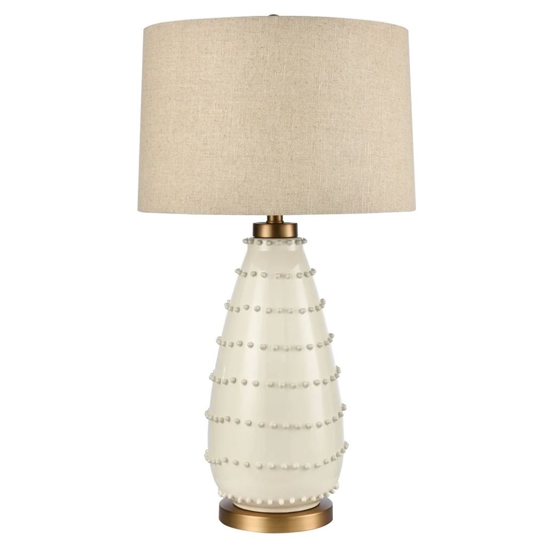 Bring a touch of refined charm to your interior with the Morton Table Lamp, where simplicity meets sophistication. Its beautifully sculpted base features a charming dotted pattern accented by intricate bronze detailing, making it a standout piece that balances artistic flair with modern minimalism.