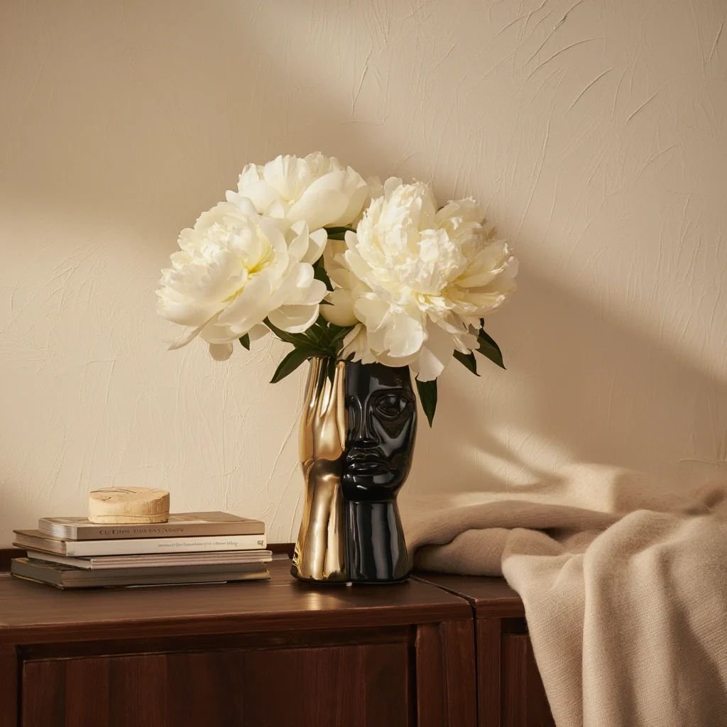 This face vase makes an immediate impression through its combination of a deep glossy black facial form and contrasting metallic accents that shift the piece firmly into art-object territory. Crafted from ceramic, the elongated silhouette carries expressive sculptural detailing that gives every angle its own distinct character. It functions as a flower vase, but its presence goes well beyond that single purpose.