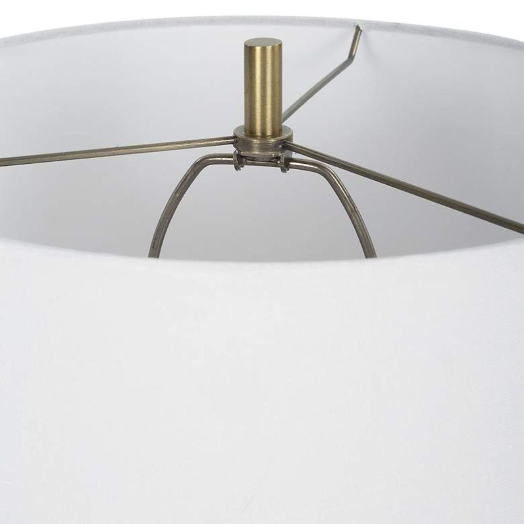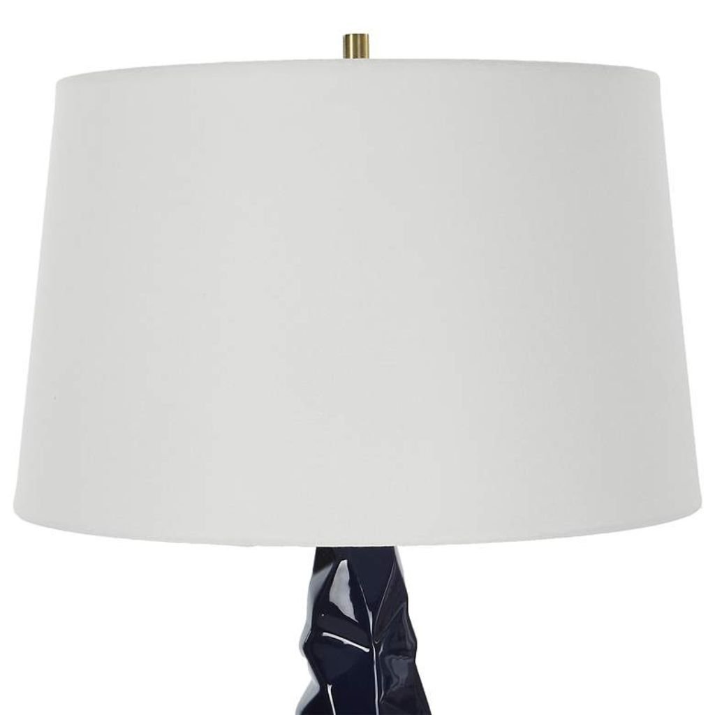 Soft ivory linen. Deep navy glaze. Brushed brass catching the light at every faceted edge. This navy blue ceramic table lamp from Uttermost’s Kavos collection is built around contrast — the kind that makes a room feel designed rather than decorated. The tall, tapering ceramic base is finished in a high-gloss navy glaze that shifts in depth depending on the light around it, giving the surface a gem-like dimensionality that flat finishes simply cannot achieve. Plated brushed brass details frame the composition with warmth, bridging the cool richness of the navy and the neutral calm of the white linen hardback shade. At 31 inches tall, this lamp earns its place on any surface that calls for presence and intention.