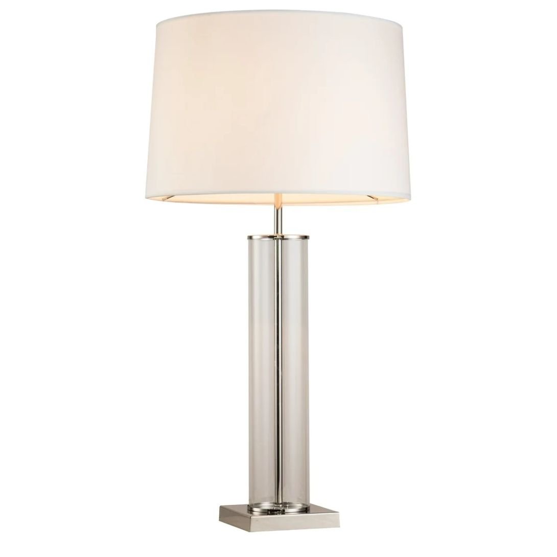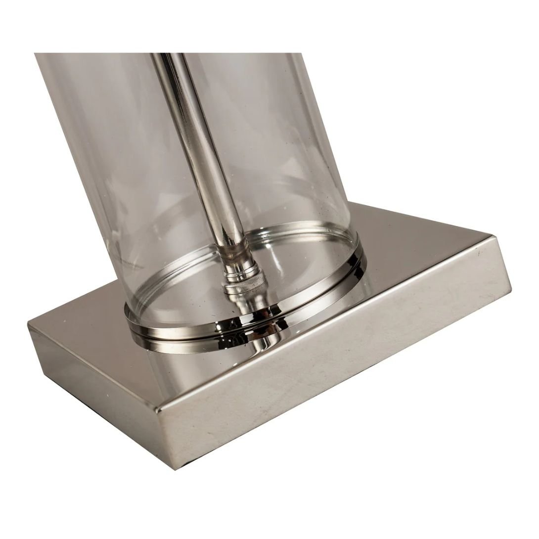 This elegant table lamp features a sleek combination of clear glass and polished nickel accents, paired with a crisp white shade that diffuses light softly and evenly. Its modern design makes it a versatile choice for a variety of interior styles, from contemporary to transitional.