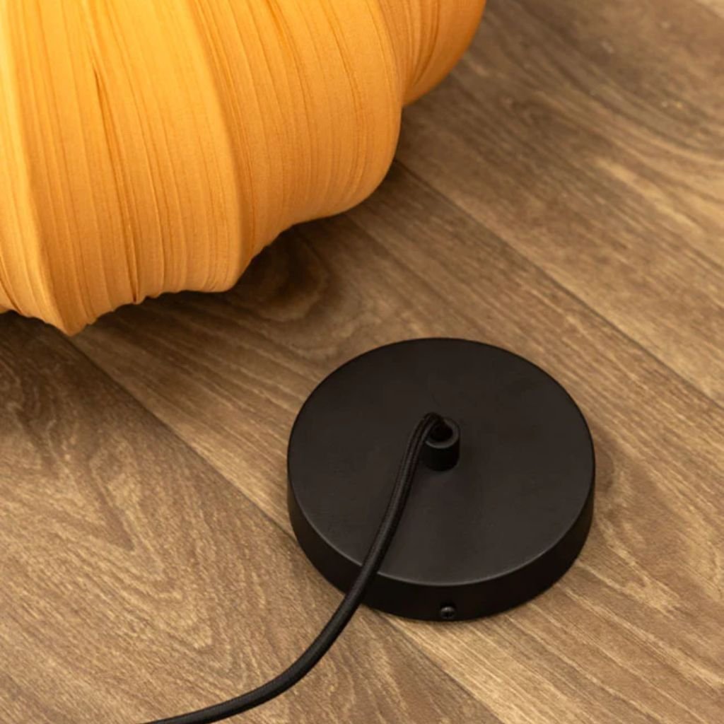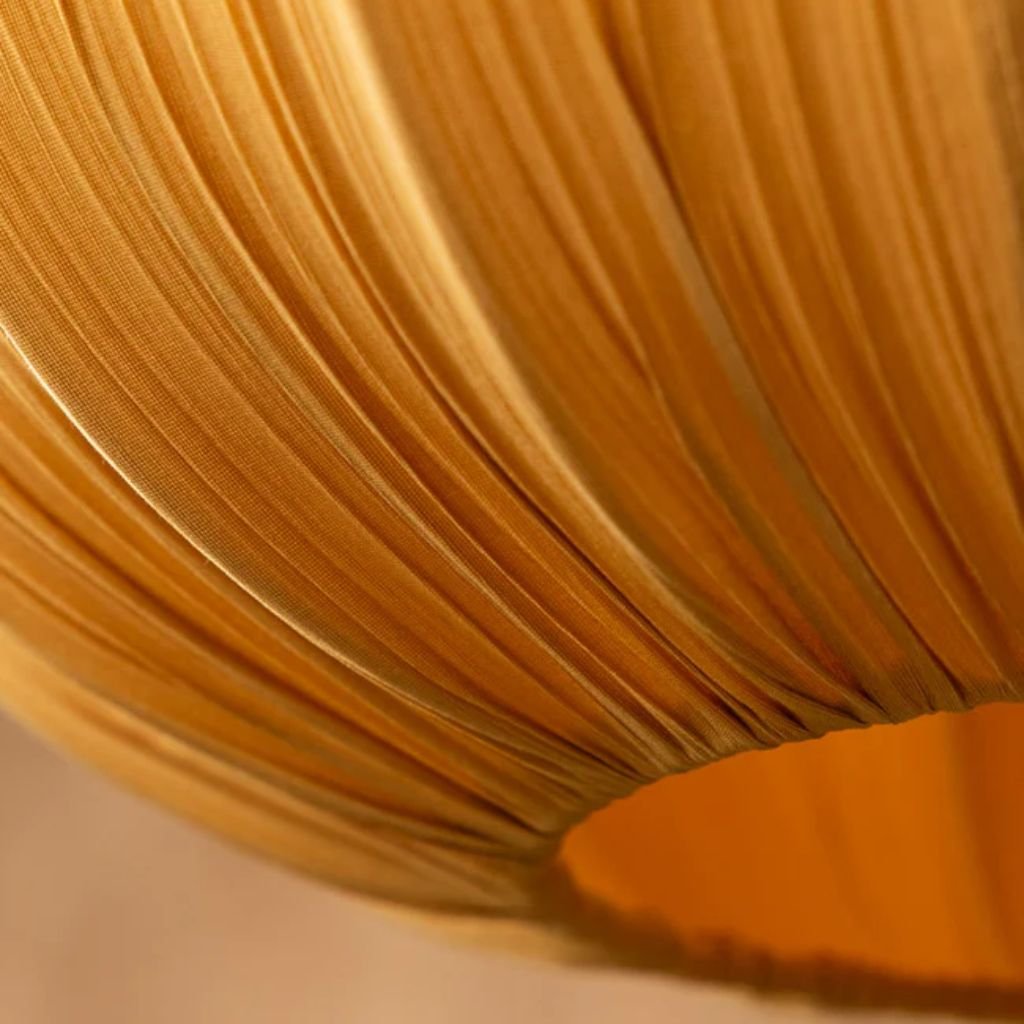 The pleated construction adds dimension and depth to the fabric shade, catching and scattering light in a way that creates a rich, layered glow. The ochre yellow is warm and energising without being aggressive.