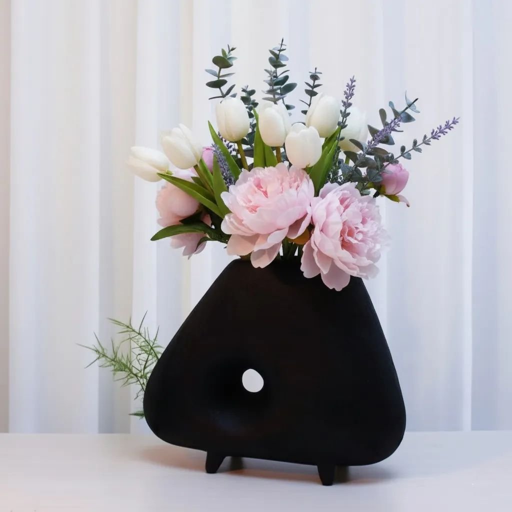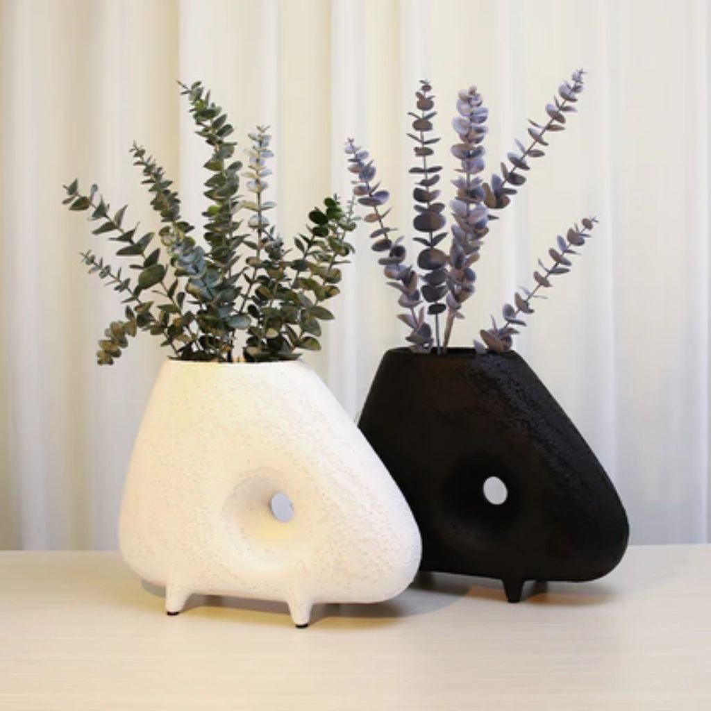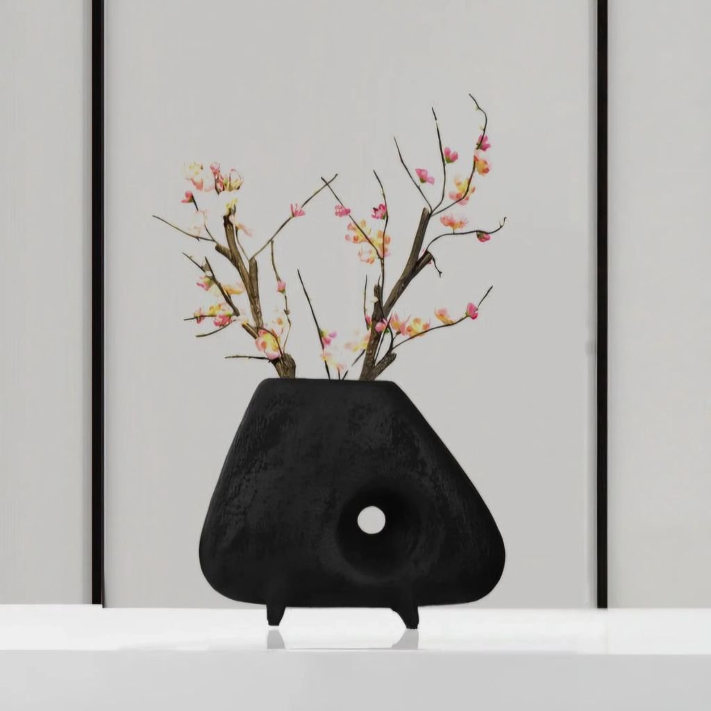 The intentional opening through the body is what distinguishes this vase from conventional forms — it introduces airiness and visual depth that a solid silhouette cannot achieve. Floral stems positioned through or around the void spread more naturally, creating compositions that feel considered rather than arranged.