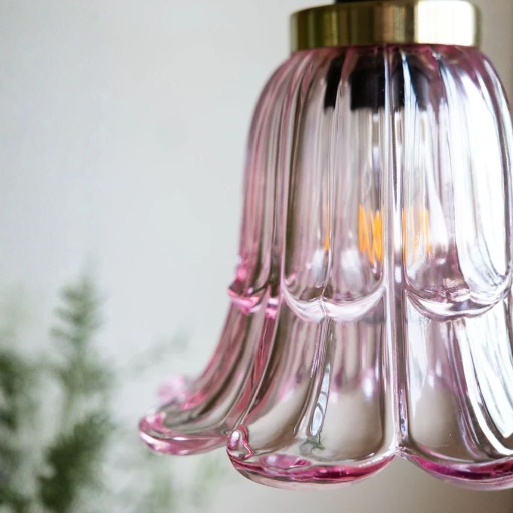 The pale pink glass creates a warm, blush-toned light that is particularly flattering in bedrooms. It adds a gentle romantic quality without being overwhelming or overtly feminine.