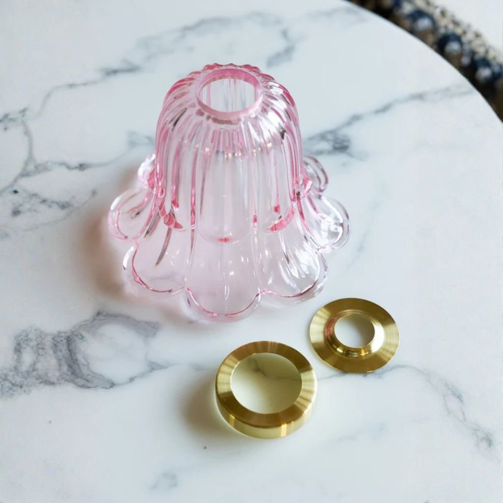 Delicate pale pink glass in an enchanting flower-like shape makes this small easyfit ceiling shade a genuinely beautiful and versatile lighting accessory. The soft hue adds a whimsical, romantic glow to the room, and the compact scale — H15.5cm x D19cm — makes it ideal for spaces where a larger shade would overwhelm. It fits directly onto existing pendant fittings as an easyfit shade with no tools needed.